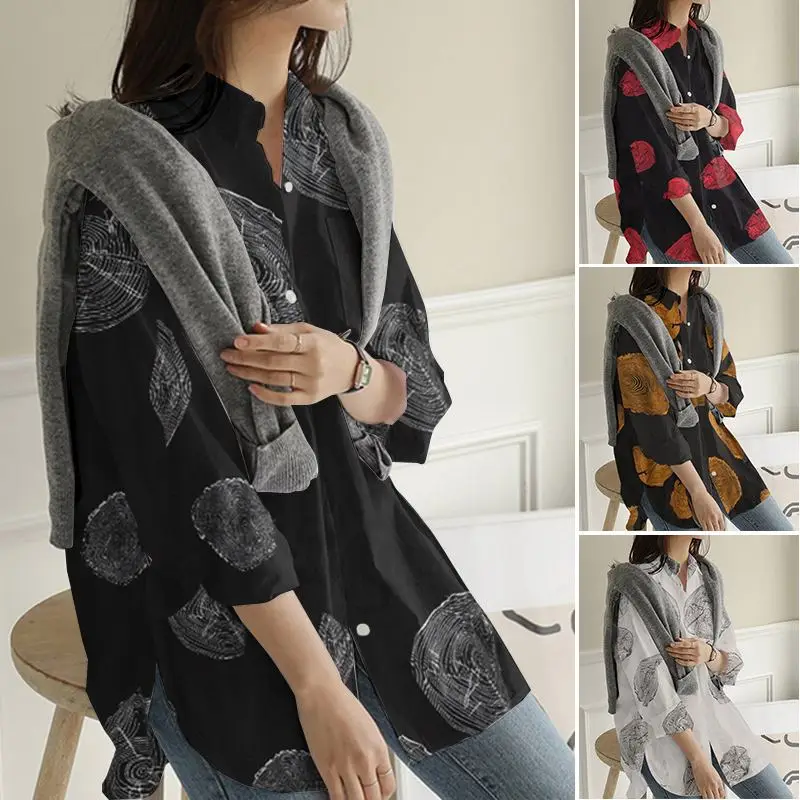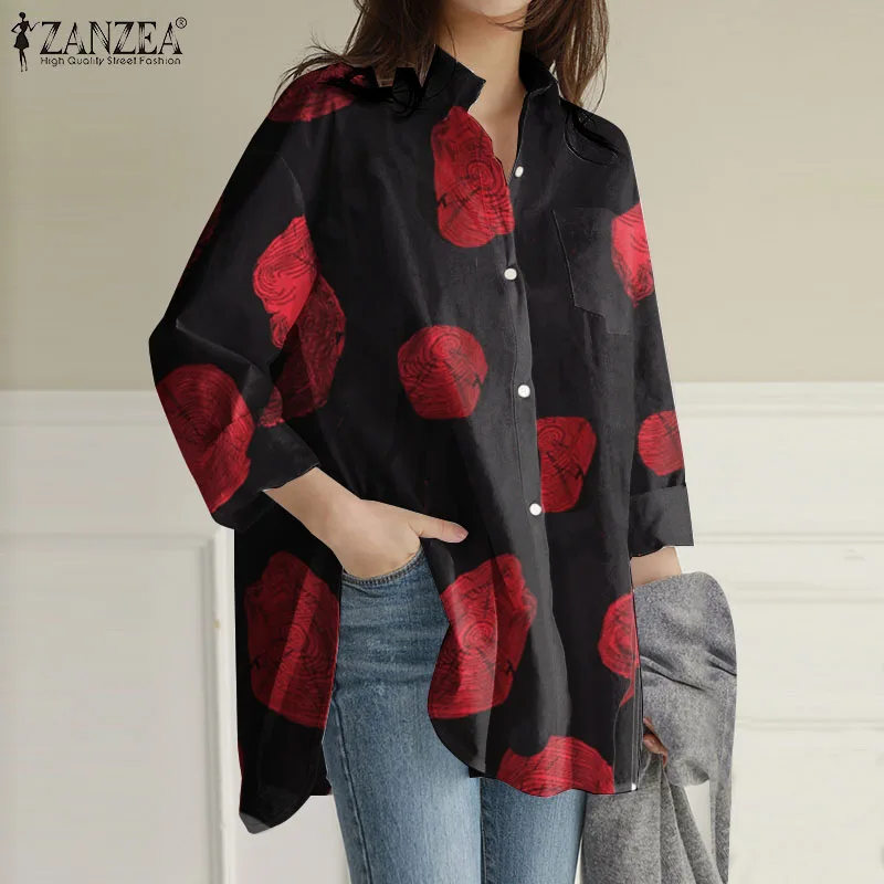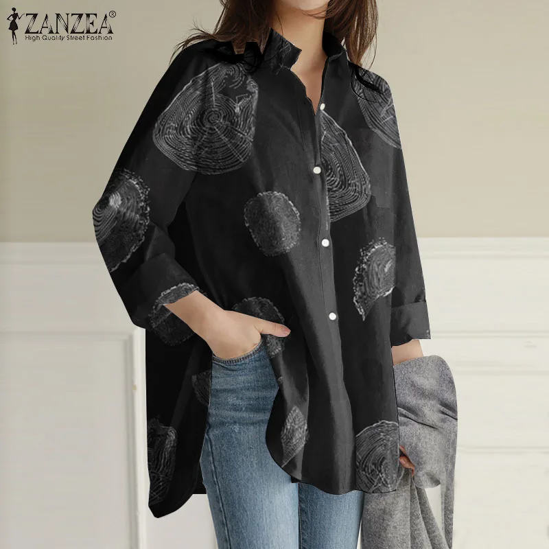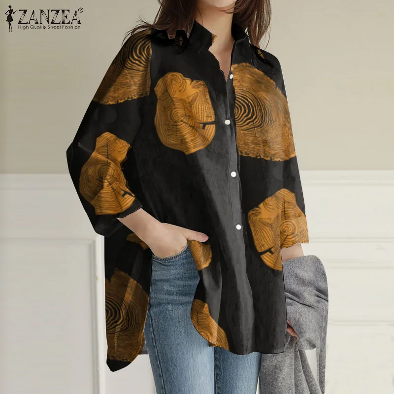 Осенняя рубашка ZANZEA 2022 с принтом, Женские винтажные нестандартные блузы, Женская Повседневная рубашка с большим отворотом, строгая сорочка