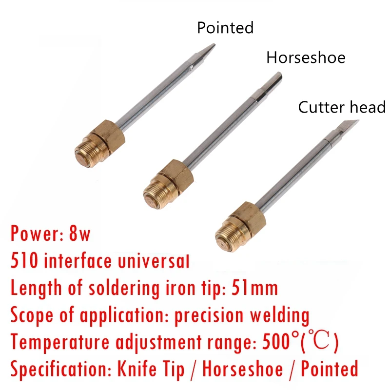 Название: наконечник паяльникаУниверсальный интерфейс 510Мощность: 8 ВтДлина наконечника паяльника: 51 ммОбласть применения: Точная сваркаДиапазон регулировки температуры: 500 °(℃)Спецификация: наконечник ножа/Подкова/острыйЦвет: ЗолотойМатериал: медь