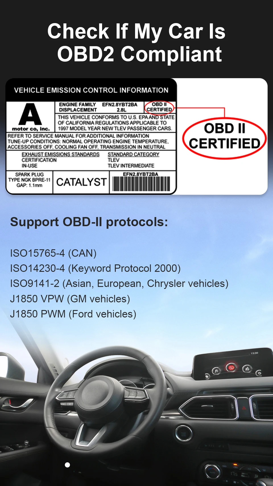 Если вы не уверены, посмотрите под капот и попробуйте найти ярлык, в котором четко указано, что транспортное средство предназначено для соответствия нормам OBD2.В этот чехол, OBDII используется в качестве общей срок и может означать любую из следующих характеристик:OBD II (California ARB)EOBD (европейский OBD)JOBD (японская OBD)Если транспортное средство не совместимо с OBD-II, вы не можете использовать этот инструмент сканирования OBD2 для получения диагностической информации от вашего автомобиля.