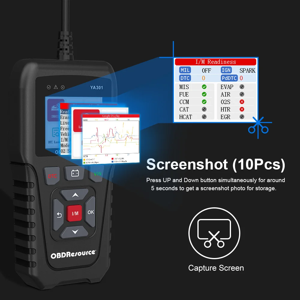 OBDResource 12V диагностические коды неисправностей автомобиля YA301 поддерживает полные функции OBD2 (для системы двигателя), включая: