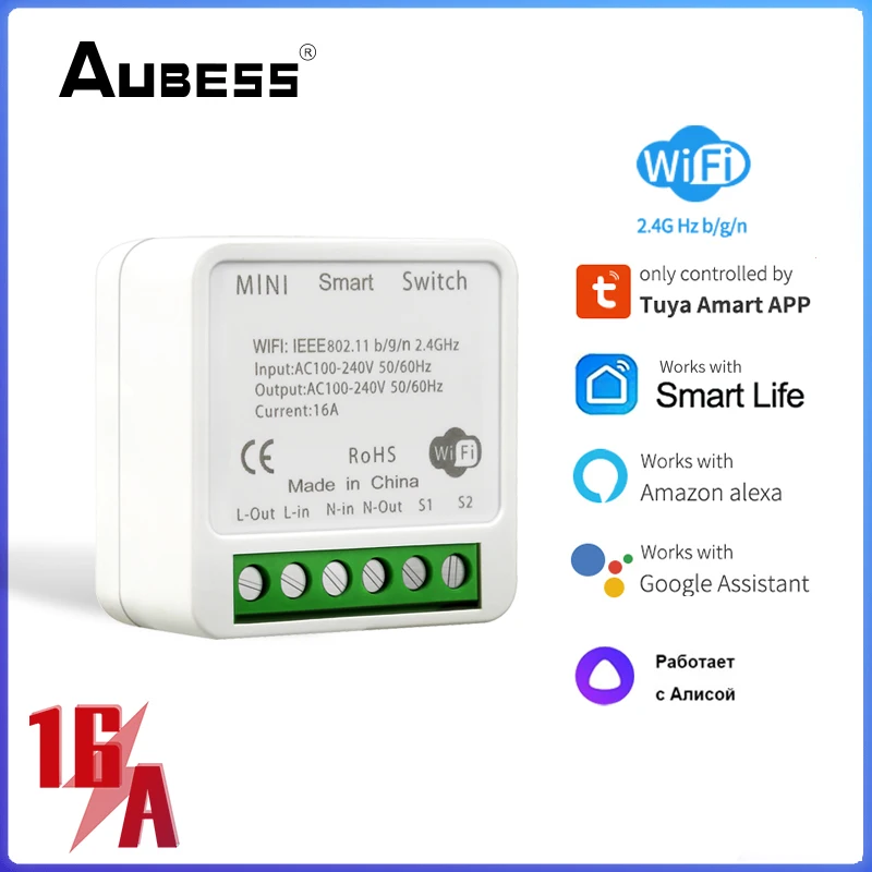 2-полосный мини-переключатель 16 А, работает с Alexa Google Home Яндекс. Алиса, поддерживает приложения TuyaSmart life, модуль выключателя таймера