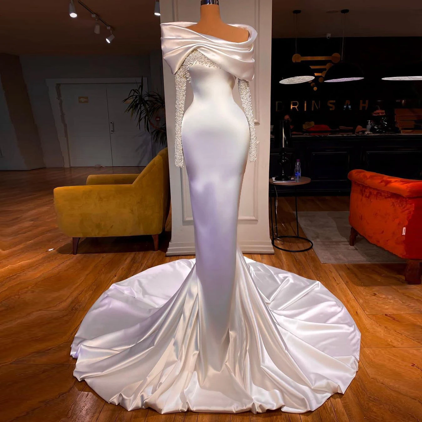 Белое элегантное вечернее платье-Русалка с длинным рукавом и открытыми плечами