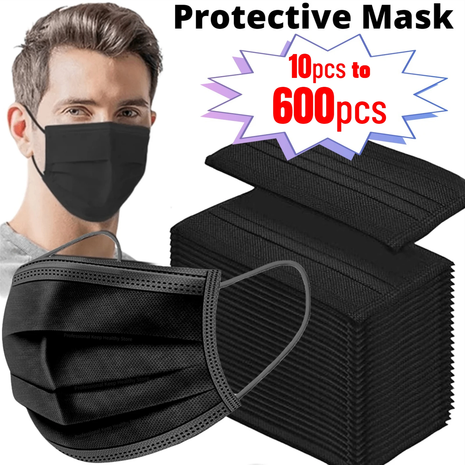 10/20 Вт, 30 Вт/40/50/100/300/400/500/600 шт Черный Одноразовая маска для лица промышленный 3ply петли уха взрослых регулируемые черные хип-хоп маска для лица