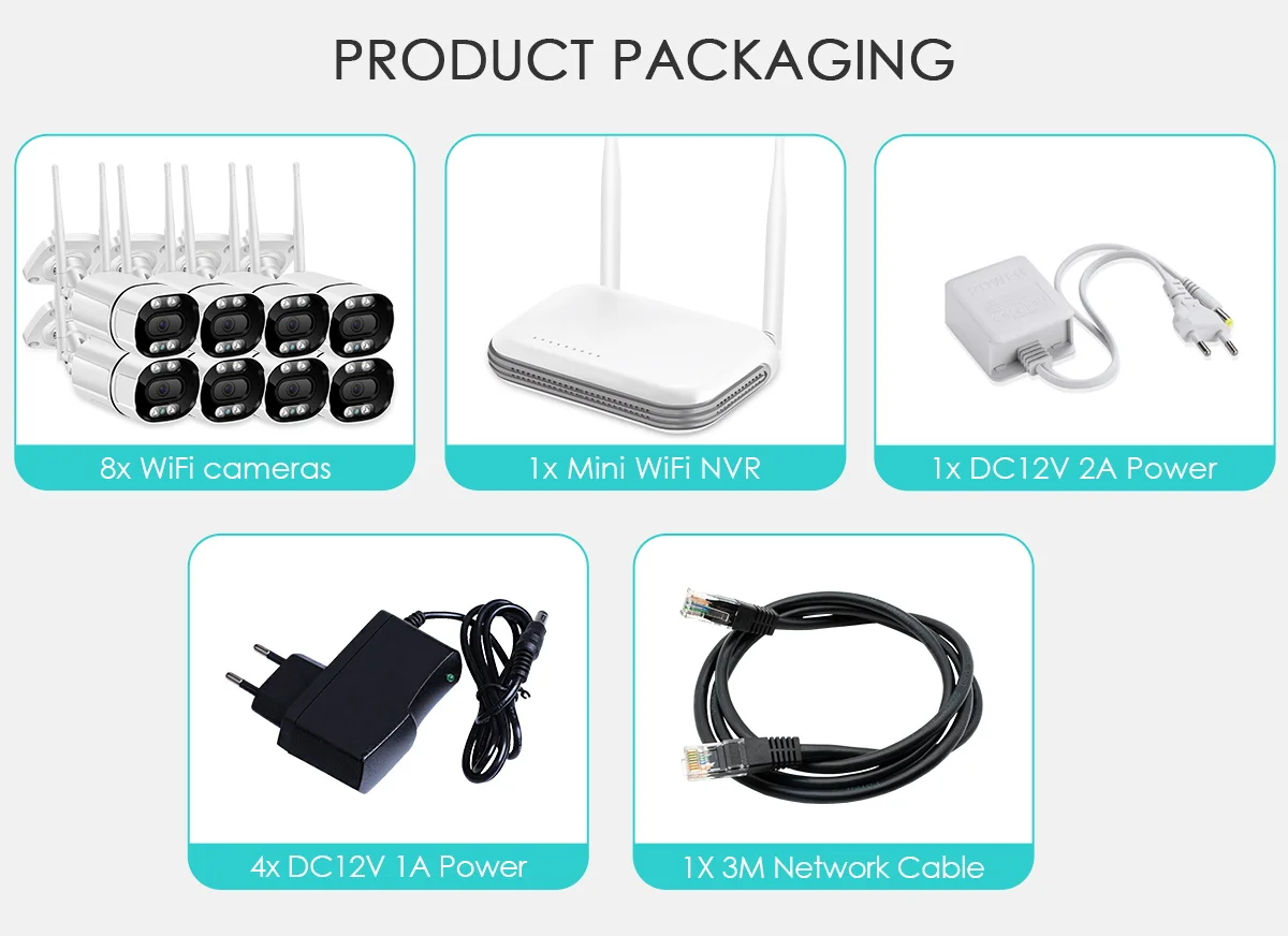 Камеры 8x (3 Мп)9x источники питания1x 8CH NVR1x RJ45 кабель
