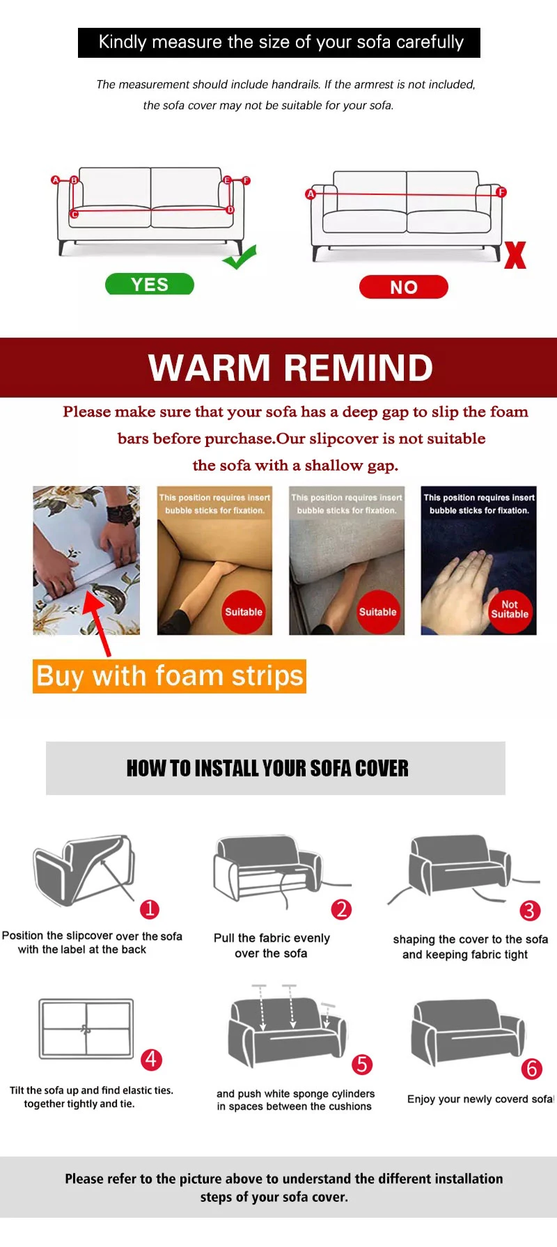 1. Этот чехол для дивана подходит для дивана, в котором есть зазор, между сидением со спинкой и подлокотником. (Пожалуйста, убедитесь, что ваш диван имеет глубокий зазор, чтобы выскользнуть пенопластовые стержни перед покупкой. Наш чехол для дивана не подходитДля дивана с мелким зазором.)2. Пожалуйста, измерьте свой диван, включая подлокотник, затем выберите размер, если вы не измерите его, крышка дивана будет меньше, чем ваш диван.3. Допускается погрешность в 1-3 см при ручном измерении, разные страны имеют разные размеры, пожалуйста, проверьте это перед покупкой.4. Из-за проблем с транспортировкой на большие расстояния, продукт будет немного складываться, он может быть не таким плоским, как на картинке, но не влияет на использование.5. Поскольку разница между различными мониторами, изображение может не отражать фактический цвет изделия. Мы гарантируем, что рисунок такой же, как показано на фотографиях.Какой из них вы не можете выбрать на картинке, пожалуйста, свяжитесь с нами.