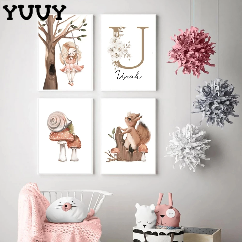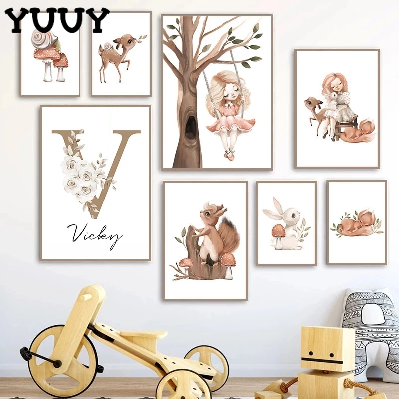 Индивидуальный постер с именем ребенка, персонализированная комната для девочек, настенный художественный Рисунок, декор с изображением кролика, оленя, лисы, грибов