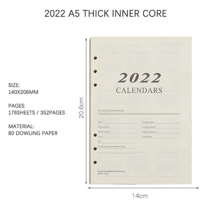 Журнал 2022, ежедневник, планнер, блокнот A5, вставки, стержни с 6 отверстиями, свободное спиральное кольцо, планер, Внутренний сердечник, бумага 80 г