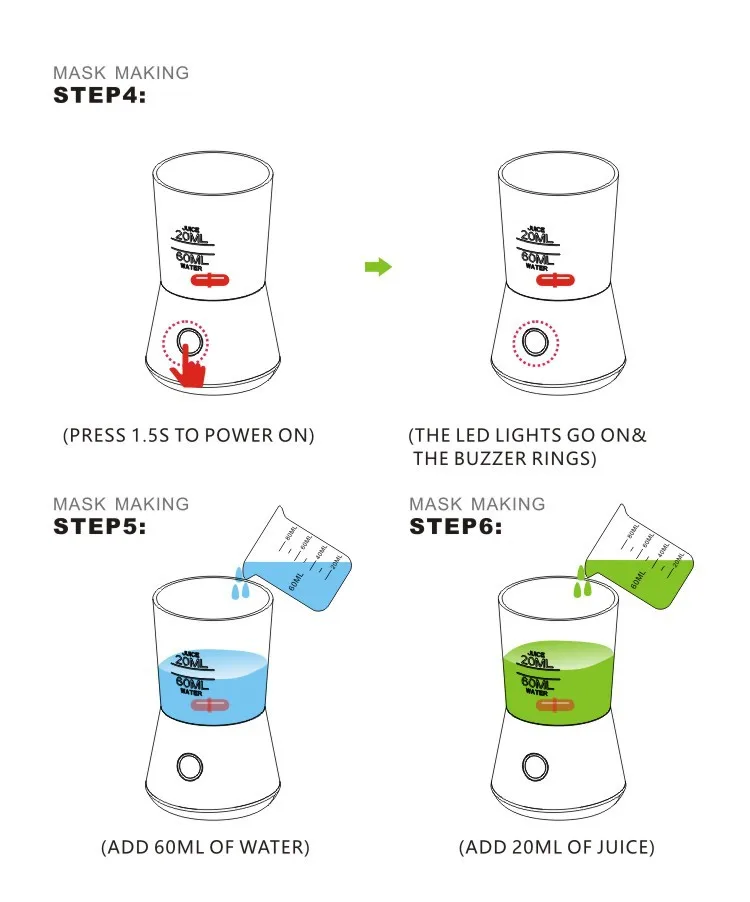 1 хост1 X лоток для маски2X2 пластины пептидов коллагена с шипучими таблетками (8 таблеток/пластин, всего 16 таблеток)1 х Руководство (подробное описание различных методов изготовления маски)1 X скребок для маски1 X цветная коробка1 пара пластырей для глаз1X1 шт. формы для губИнструкции:1. После вставки двух 3AAA батарей, включите машину.2. Добавьте 60 мл воды выше 75 градусов Цельсия.3. Добавьте 20 мл фруктового сока или добавьте молоко, красное вино, овощной сок и т. д. (в соответствии с вашими потребностями), этот 20 мл фруктового сока очень маленький, вы можете вручную выжать сок.4. Добавьте зерна коллагена.5. Запуск машины.6. Машина имеет функцию автоматического синхронизации. 3-4 минуты после включения, он автоматически прекратит работу и отправит музыку, чтобы напомнить вам, что маска сделана.7. Налейте подготовленную жидкость в лоток для маски или в форму маски для глаз.8. После охлаждения вы можете наслаждаться маской.