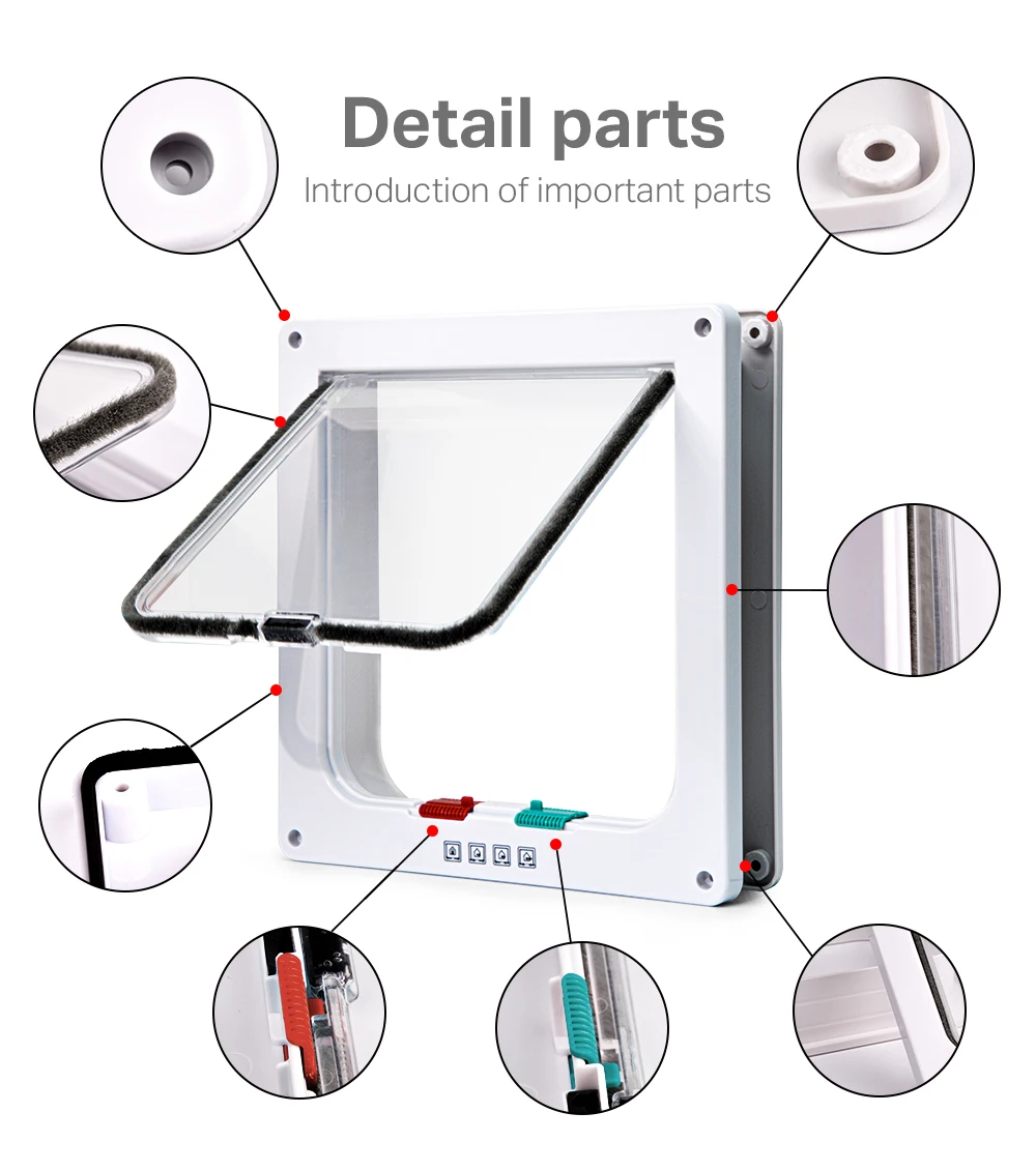 1. Легко установить, просто и щедро.2. Качество очень хорошее, с использованием АБС-материала (очень хороший вид пластика)3. Большой, относительно большой размер, подходит для многих полных кошек.4. Четыре основные функции:(1) без входа и выхода (полностью закрыт)(2) можно войти и выйти (Полностью открыть)(3) только внутри, но не снаружи(4) только выход, но не в
