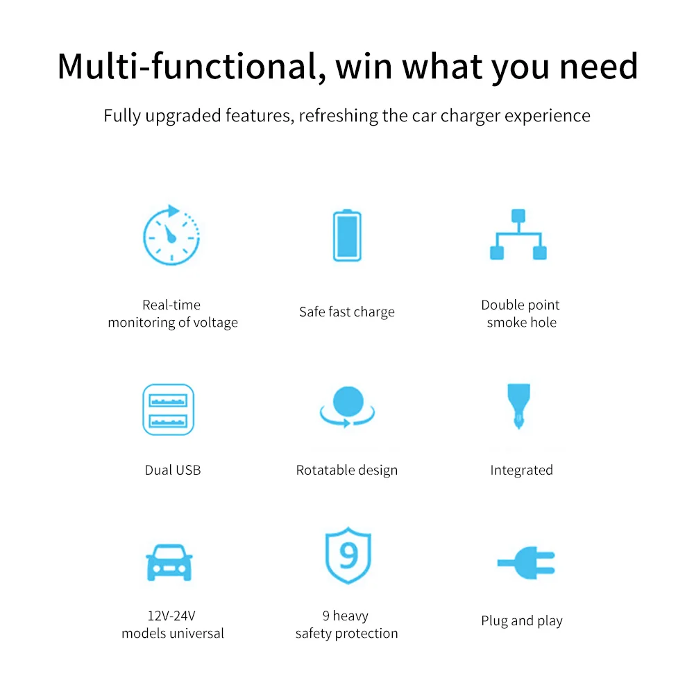 Двойной USBДвойной порт USB может поддерживать одновременную зарядку двух устройств, с одним портом USB 2,4 A макс. ток (всего 3,1 А). Интеллектуальная Быстрая зарядка может увеличить скорость зарядки 60% и сэкономить время зарядки 40%. Интеллектуальный чип может эффективно контролировать температуру, чтобы избежать высокой температуры.Двойные порты прикуривателяАвтомобильный сплиттер также имеет двойные порты прикуривателя, что удобно для пользователей для одновременной зарядки различных устройств.Дисплей напряженияЕсть экран для отображения напряжения аккумулятора автомобиля, защищающий ваше безопасное вождение.Пряжка из нержавеющей сталиПряжка из нержавеющей стали может эффективно зафиксировать зарядное устройство в порту питания стабильно, даже в неровной дороге.ПоворотныйАвтомобильное зарядное устройство может поворачиваться в диапазоне 110 градусов в соответствии с вашими потребностями. Удобно для пользователей регулировать подходящий угол.ЗащитаАвтомобильный сплиттер обеспечивает различную защиту, включая защиту от перенапряжения, защиту от низкого напряжения, электромагнитную защиту, защиту от обратной вставки, защиту от короткого замыкания, защиту от высоких температур, защиту от перегрузки и защиту от перегрузки по току.Область примененияАвтомобильное зарядное устройство, которое относится к напряжению 12-24 В, совместимо с большинством транспортных средств, включая автомобиль, грузовик, внедорожные транспортные средства и так далее. Спецификация:Тип: зажигалкаКоличество: 1 шт.Материал: ABS + PC + электрический компонентЦвет: черныйВход: 12-24 ВОбщий выход USB: 5V3.1A MAXДвойная Зажигалка Общая мощность: 120 ВтРазмер: 123*80 мм/4,83*3,14 ''(Д * В)Вес нетто: 70 г/2,47 унций Посылка:1 * Прикуриватель Упаковочный лист