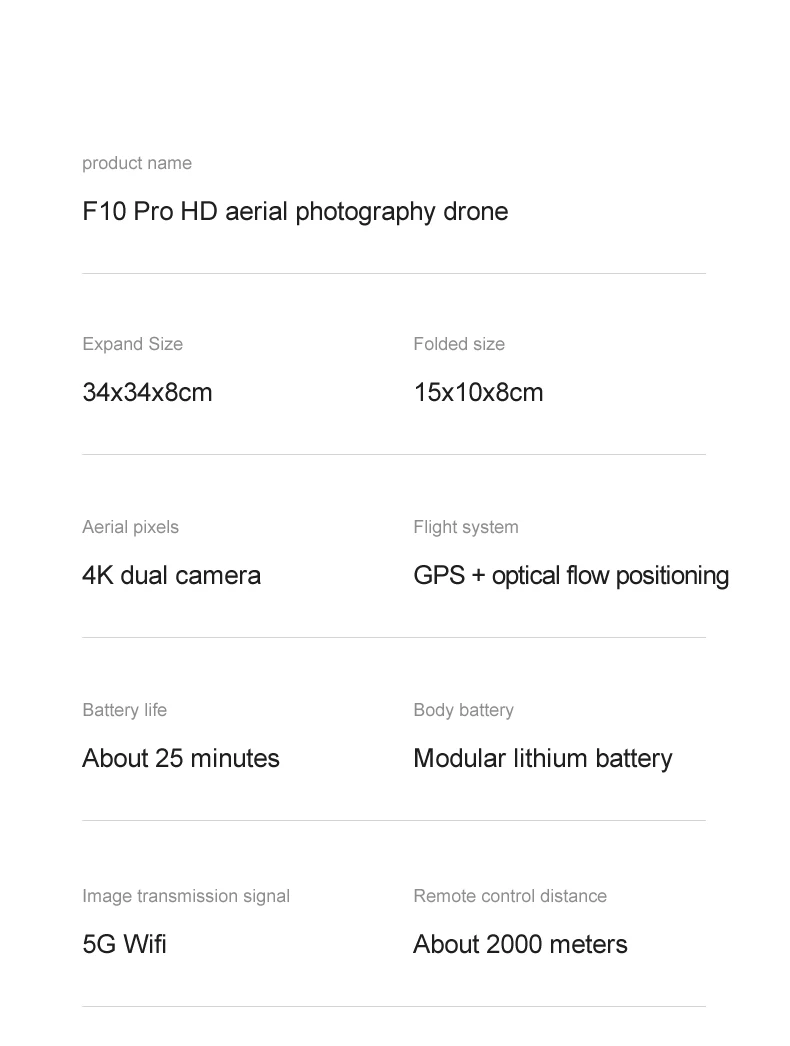 Номер товара. : F10Частота: 2,4G/5G (опционально)Канал: 4CHGy ro: 6 ax isДвигатель: 8*23 мм без щетокАккумулятор квадрокоптера: 7,3 В 1600 мАч Lipo (входит в комплект)Передатчик Батарея: 3x1,5 AAA Батарея (не входит в комплект)Время полета: 23-25 минутВремя зарядки: 120-150 минутРасстояние дистанционного управления: 300-500 мЦвет: как показаноКамера дополнительно: 2,4G WIFI 1080P/2,4G WiFi 4K HD/5G WiFi 4K HD/5G WIFI 1080PFOV: широкий угол 120 °1080P пикселей:Изображение: 1920*1080 (сохранить на мобильный телефон)Видео: 1920*1080 (сохранить на телефоне)4K пикселей:Изображение: 3840*2160Видео: 3840*1080APK: (поддерживает IOS 6 или выше и Android 4,4 или высококлассные системы)Четырехсторонний Размер:Размер складывания изделия (см): 15*10*8 смРазмер (см): 34*34*8 смОсобенности:-С складными ручками, компактно и легко носить с собой.-Режим позиционирования GPS может обеспечить более точный полет.-С функцией Wi-Fi 5G/2,4G, можно подключить к приложению, системе APK, чтобы делать фотографии/видео, передавать изображения в режиме реального времени через мобильный телефон-камеру-5G Wi-Fi fpv расстояние может достигать 300 м.2,4G WIFI 1080P/2,4G WiFi 4K HD / 5G WiFi 1080P/5G WiFi 4K HD камера может предоставить различные изображения и видео высокой четкости.-С функцией режима удержания высоты, он может обеспечить стабильный полет.-Орбитальное движение сделает самолет лететь кругами, обеспечивая более холодный угол съемки.-Режим полета Waypoint, просто нарисуйте маршрут на экране и используйте вертолет в качестве заданного пути.-Время полета до 25 минут.-Безголовый режим, не нужно регулировать положение самолета перед полетом.-Функция возврата одним нажатием кнопки, вы можете легко найти свой путь домой.-Взлет/посадка одним щелчком. Одним нажатием кнопки взлета или посадки автоматически, Дрон будет снимать или возвращать в положение взлета.-Защита от перегрузки по току при низкой мощности.-Анти-помех использует 2,4 ГГц технологии.-4 канала, вы можете летать вверх, вниз, вперед, назад, влево, вправо.-Шестиосевой гироскоп для более стабильного полета и более легкого управления.-Он имеет 3 уровня переключения скорости полета, чтобы сделать полет более веселым.-Четырехроторный фюзеляж изготовлен из высокопрочного, высокопрочного инженерного пластика, который является светильник и долговечным.Функции:Вверх/вниз, вперед/назад, влево/вправо, боковой F светильник, уровень 3 F светильник скорости, светодиодный светильник, следуй за мной, F светильник вокруг, Waypoint F светильник, режим удержания высоты, безголовый режим, возврат одной кнопкой, Взлет/посадка одной кнопкой, WiFi FPV, камера/видеоПосылка включает в себя:1 x Квадрокоптер F101 пульт дистанционного управления1x3,7 V литиевая батарея (вы можете выбрать нужный номер, после чего батареек при заказе)1 х USB кабель для зарядки1 отвертка1 x Руководство пользователя2 запасных лезвияМы рекомендуем использовать наши оригинальные запасные части F10. Если клиент, который использует запасные части, такие как аккумулятор других продавцов и вызывает проблемы с дроном F10, мы не предоставляем гарантийное обслуживание.Общая проблема и решение:Вопрос: Почему дрон не может снимать при использовании приложенияО: если вы используете приложение, чтобы снять с помощью кнопки, вам нужно сначала использовать удаленную разблокировкуВопрос: Почему камера не может двигаться вверх и вниз с помощью пульта дистанционного управленияA: легкий, без карданного шарнира, фиксир
