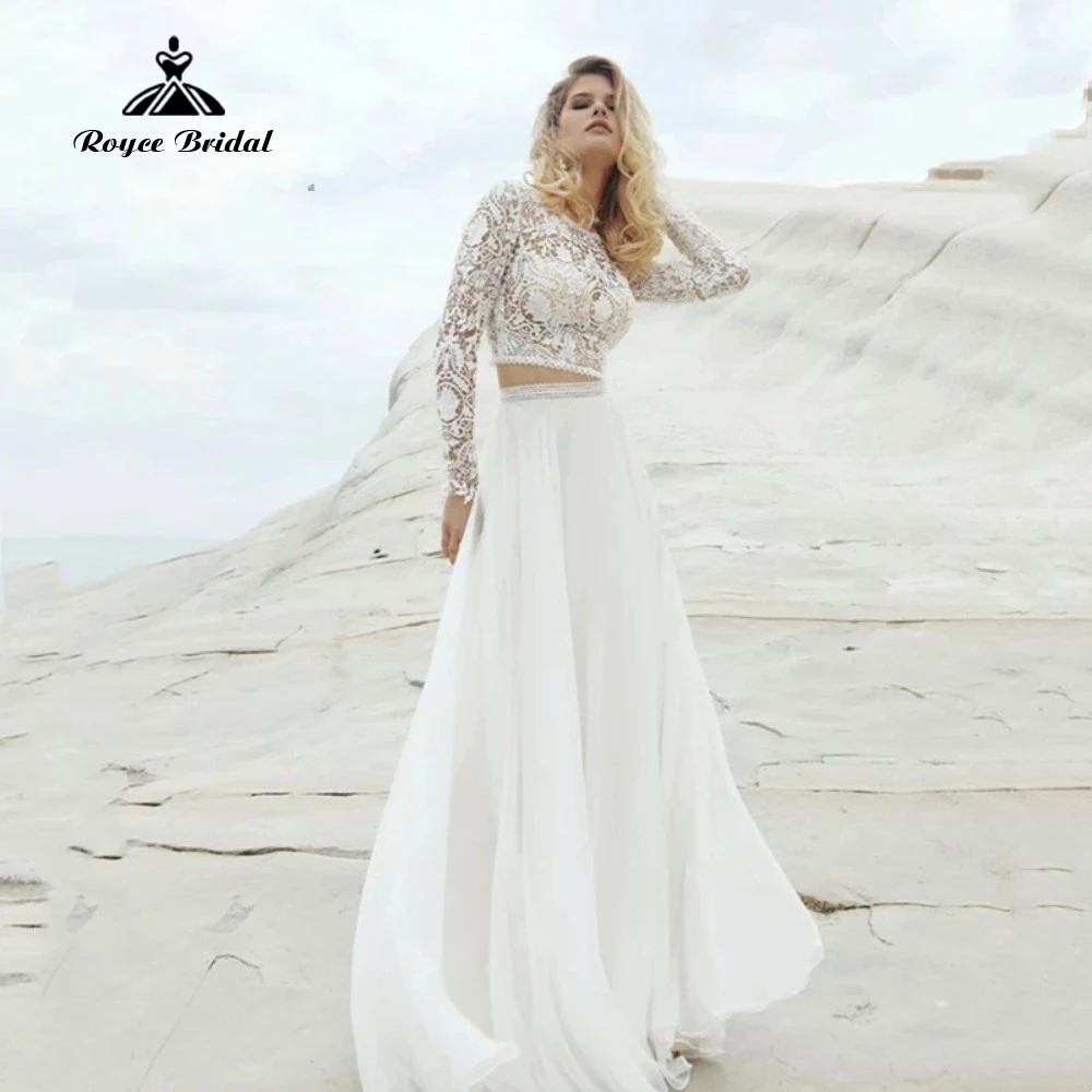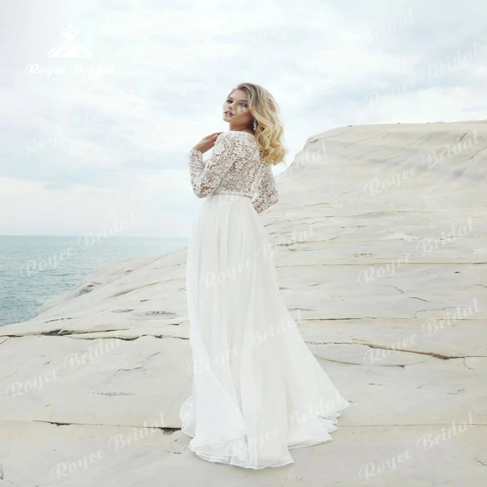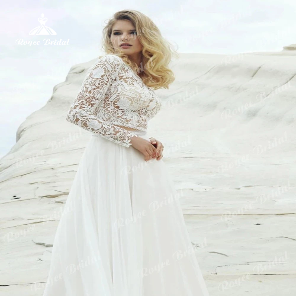 Женское свадебное платье в стиле бохо, Кружевной Топ с длинным рукавом-крылышком и А-силуэтом, шифоновое платье до пола из двух предметов, 2022