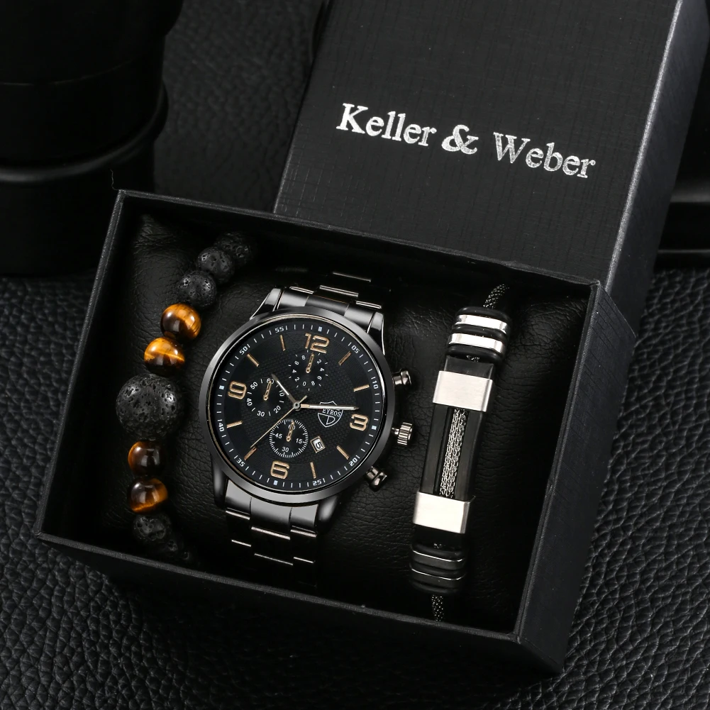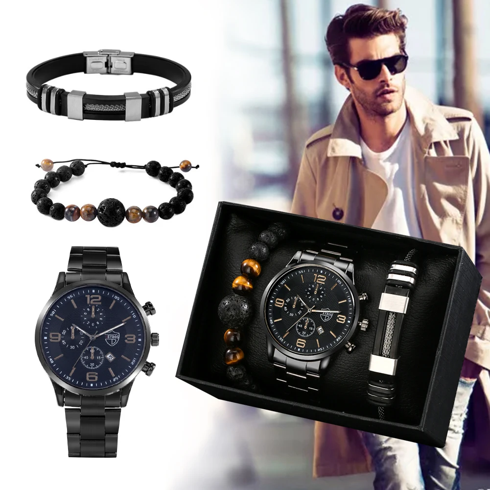 Роскошный комплект мужских кварцевых часов, модные часы, браслеты, подарочный набор для мужчин, браслет с бусинами, мужские наручные часы, мужские часы