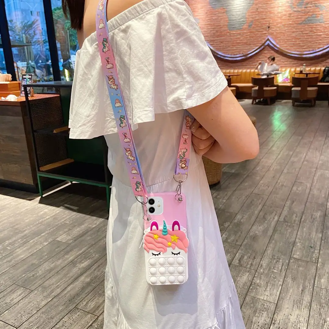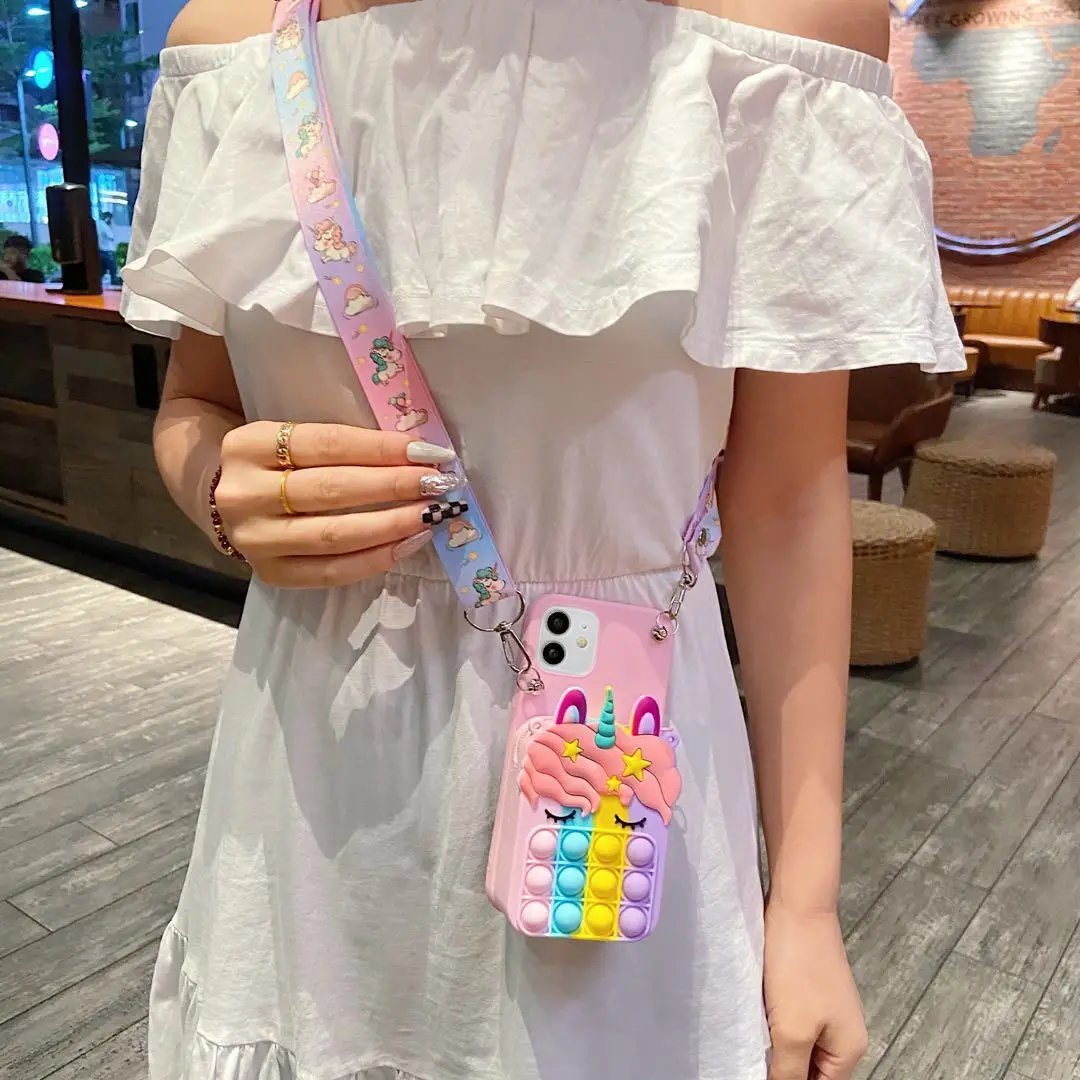 Features3D Cartoon Rainbow Unicorn Coin Purses Wallet Card Holder Case Pop Fidget Toys Push Bubbles Relieve Stress with Neck Strap Rope Lanyard