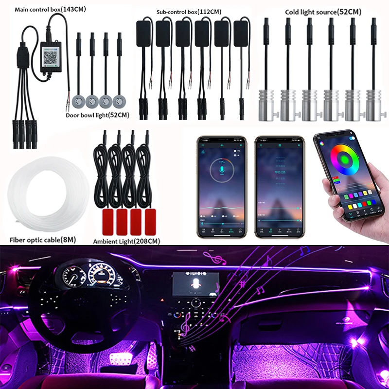 -Тип изделия: 10 в 1(8 м волоконно-оптическая лента + 4 окружающих (ножной) светильник s + 6 головок источника светильник + Главный блок управления + 6 элементов управления)