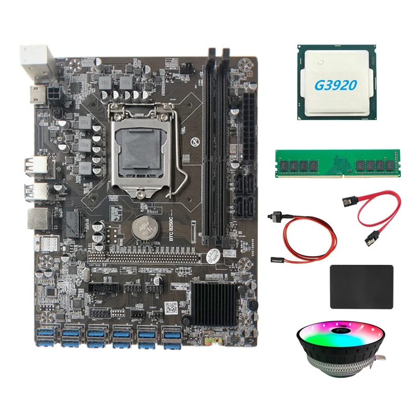 Материнская плата B250C для майнинга + процессор G3920 + вентилятор RGB + DDR4 4 ГБ ОЗУ + SSD 128 ГБ + кабель переключателя + кабель SATA 12XPCIE в ГПУ слот для карты USB3.0