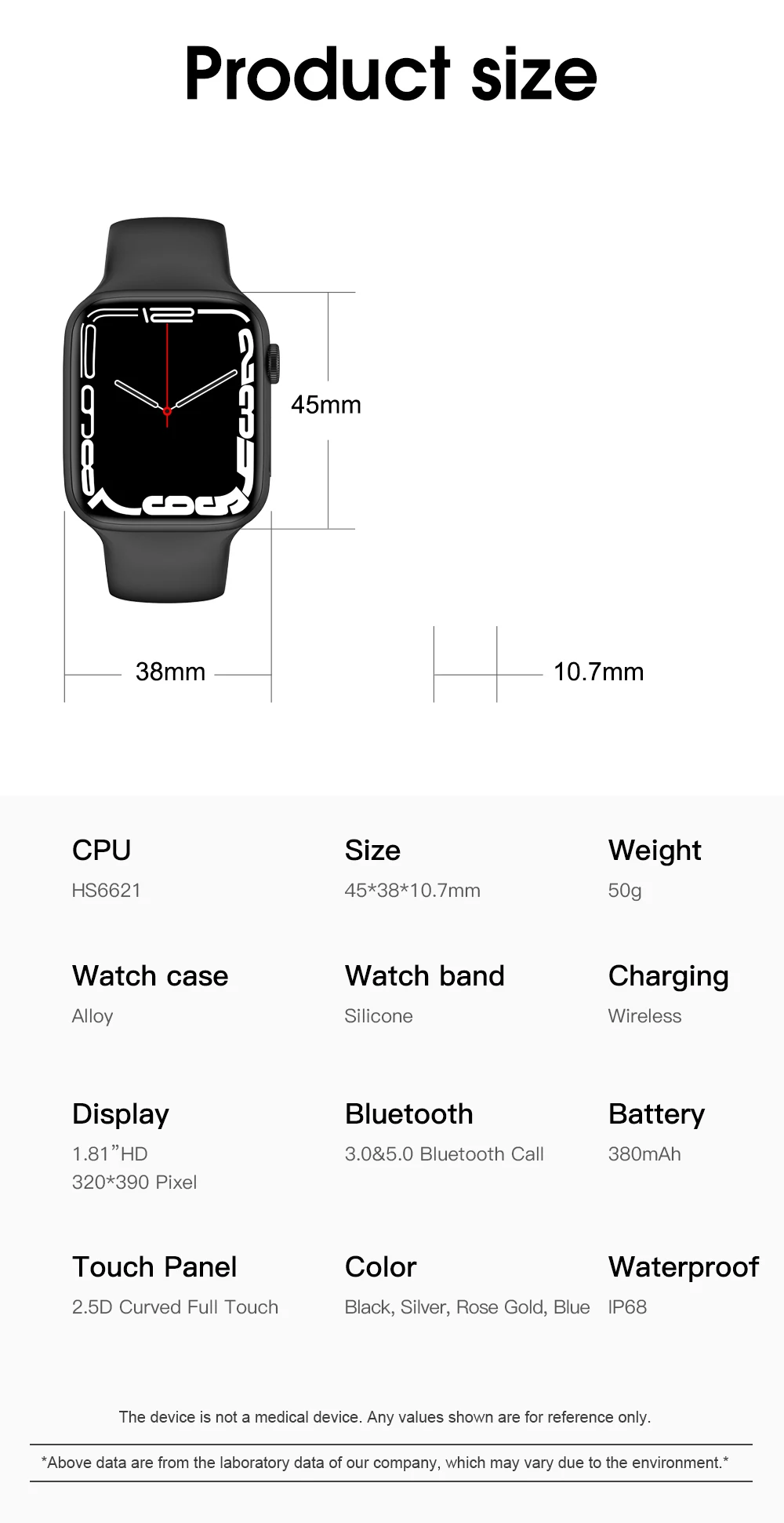 Платформа: Hunterson HS6621; Основная частота: 128 МГц; ОЗУ: 256кб; ПЗУ: 8 Мб + 128 МбСтандарт качества GB4943.1-2011; ГБ/T22450.1-2008Размер: 45*38*10,8 ммВес: 50 гЧехол: вакуумное покрытие из сплаваРемешок: оригинальный 44/45 ммЗарядное устройство: Беспроводная зарядкаЗеленый продукт: сертификат CEЦвет: черный, серебристый, синий, розовое золотоДисплей: 1,75 дюймов TFT экран, 320*385 пикселейСенсорная панель: несколько касанийУведомления: звонки, электронная почта, SMS, WhatsApp, Wechat и т. Д.Частота сердечных сокращений: автоматический 24H мониторШагомер: Ежедневный подсчет шагов, подсчет калорийМонитор сна: объективная и научная количественная оценка для записи и анализа состояния сна, каждую ночь с 9 до следующего дня автоматически включаетсяBluetooth BT 3,0 + 5,0Батарея: литий-ионный полимерный аккумулятор 230 мАч, беспроводное зарядное устройство, 150 минут для полной зарядкиВибрационная опораЯзыки часов: китайский, английский (по умолчанию), немецкий, французский, итальянский, испанский, японский, польский, русский, португальский, вьетнамский, корейский, арабский, иврит, тайский, хорватский, турецкий, чешский, голландский + Индонезийский, Малайзийский, финский, греческий, румынский.