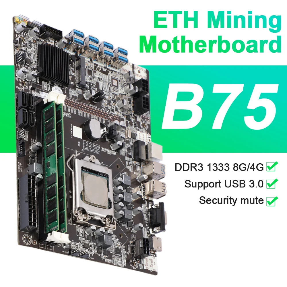 Описание:B75 ETH Mining материнская плата 8 USB 3,0 для PCIE слот GPU DDR3 LGA1155 PC настольная материнская плата с процессором Ethereum MiningИнтерфейс USB 3.0: Мгновенная скорость передачи данных в 10 раз быстрее, чем USB 2,0 через функцию plug and play.2 * DDR3 DIMM двухканальный слот для памяти, максимальная поддержка памяти 32 Гб, более высокая скорость чтения, значительно повышает производительность материнской платы.Высокая энергия тепловыделения, не боится высокой температуры, сильный дизайн тепловыделения, чтобы обеспечить полную скорость работы процессора.Материнская плата B75 mining machine-низкое энергопотребление, низкое тепловыделение, энергосбережение и энергосбережение. Настоящая работа для вас длительная и полезная.Наша материнская плата имеет стабилизированные конденсаторы, которые могут обеспечить стабильное напряжение для вашего электрического оборудования.Характеристики:Название продукта: материнская плата ETH miningЦвет: черныйМатериал: PCB + металлМодель продукта: B75Процессор: поддерживает все процессоры серии LGA1151Набор микросхем: с использованием высокоскоростного чипсета B75Память: 2 * DDR3 DIMM слот памяти поддерживает двойной канал, максимальная поддержка 32 ГбДругое: b75 lga 1155 m другая плата, b75 mining m другая плата, lga 1155 m другая плата, ddr3 m другая плата, gpu mining m другая платаПримечание:-Возможны незначительные погрешности в размере при ручном измерении.-Отклонение цвета может отличаться из-за различных настроек монитора, пожалуйста, поймите.