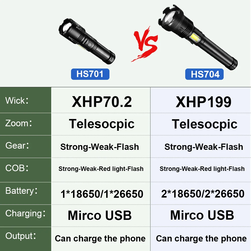 • Самый мощный тактический фонарик, с помощью самого мощного XHP199 светодиодный фитиль• 7 режимов, COB светильник (красный светильник и белый светильник) сбоку• Пресс-форма-4 уровня совмещенное отображение работы батареи (100%-75%-50%-25%), Предупреждение о низком заряде батареи.• Используйте аккумуляторы 18650 или 26650, внутренняя проводка использует высокоэффективную схему повышения для максимального использования батарей.• Водонепроницаемый класс соответствует IPX-6, водонепроницаемый, может использоваться в дождливые дни, но не может быть помещен в воду• Фонарик может использоваться в качестве мобильного источника питания. Это важный продукт для кемпинга и путешествий.• С ударопрочностью 2 метра, он подходит для охоты, кемпинга, работы, учебы, предупреждения, поиска и спасения, альпинизма и т. д.