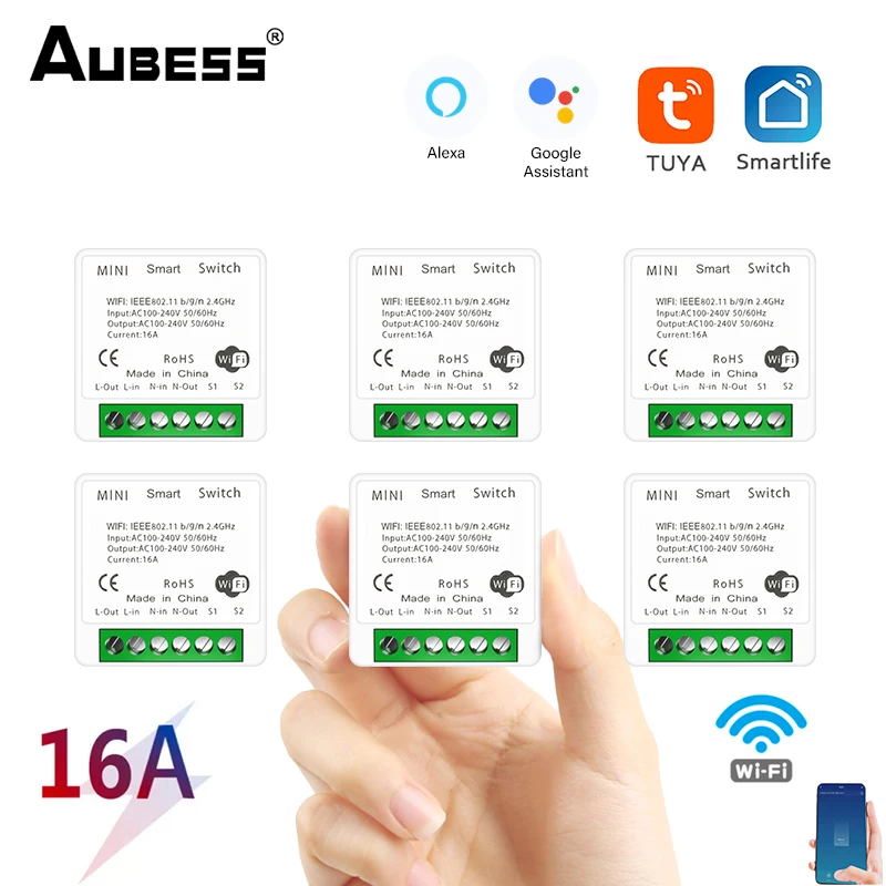 Умный мини-выключатель Aubess, 16 А, Wi-Fi, таймер с двухсторонним управлением, беспроводные переключатели, автоматизация умного дома, Совместимость с Alexa Google Home