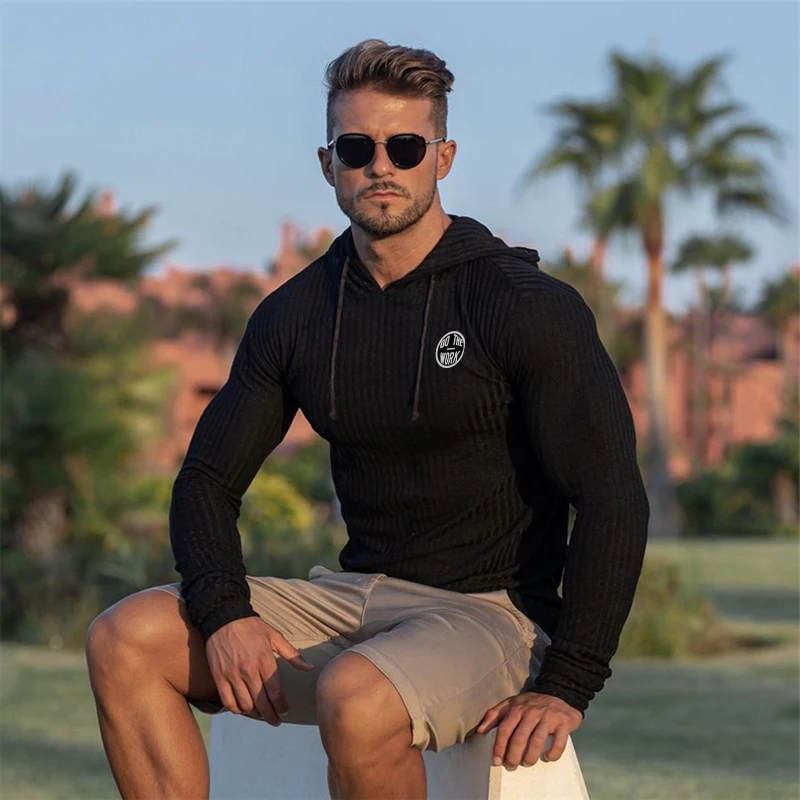 Осенняя Модная трикотажная футболка с капюшоном, мужские облегающие...