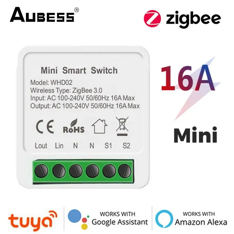 Умный мини-выключатель AUBESS Tuya ZigbeeWi-Fi, двухсторонний переключатель 16 А, автоматический выключатель для умного дома, работает с Alexa Google Home