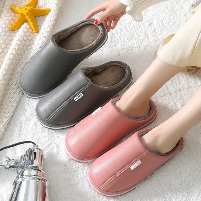 Мужские домашние зимние домашние теплые тапочки на толстой подошве плюшевые Водонепроницаемые кожаные домашние тапочки мужская хлопковая обувь тапочки для женщин