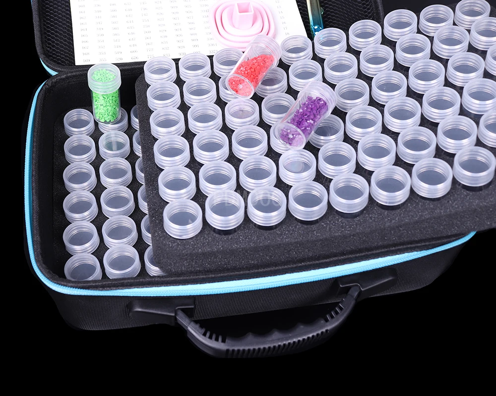 Жесткий материал EVA, прочный, водонепроницаемый, прочный и стильный дизайн; 120 шт небольших отдельных прозрачных банок с губами в чехол; предварительно вырезанные отверстия для внутренней пены не позволяют маленьким банкам связываться друг с другом; Идеально подходят для хранения 5-10 граммов (1000-2000 шт) алмазной живописи для каждой маленькой банки; Удобная ручка убедитесь, что вы можете взять его куда угодно; Дизайн молнии с большой герметичностью, ударопрочностью и защитой от падения.