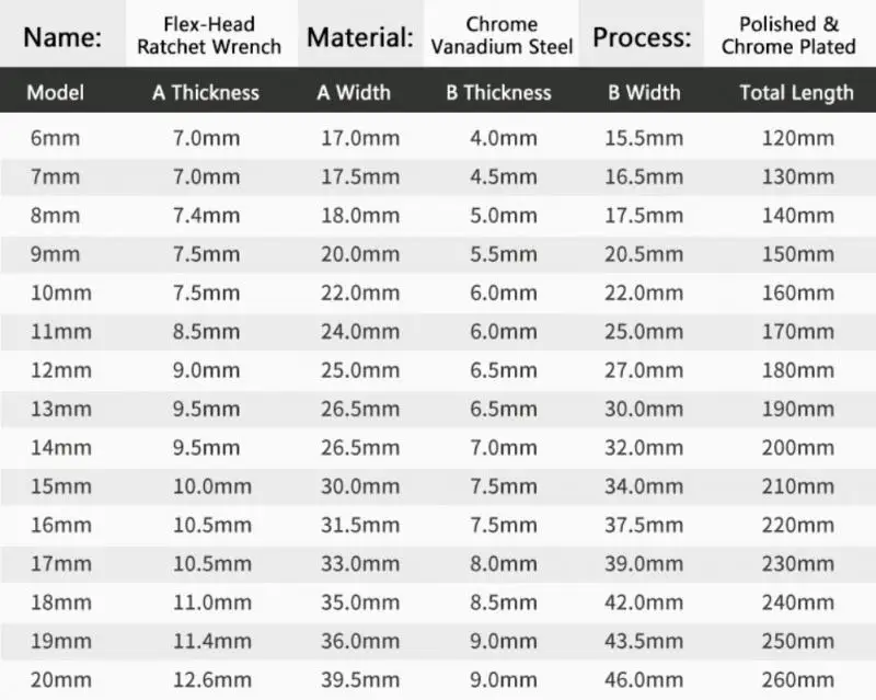 72 зубца идеальной точности. Гаечный ключ с гибкой головкой включает 6 мм, 7 мм, 8 мм, 9 мм, 10 мм, 11 мм, 12 мм, 13 мм, 14 мм, 15 мм, 16 мм, 17 мм, 18 мм, 19 мм, 20 мм