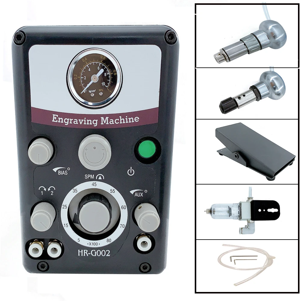 Гравировальная машина HH-G01 имеет соединения для двух ударных наконечников и вспомогательное воздушное соединение для других воздушных инструментов, включая ротационный наконечник. Две наконечники и управление одной ногой поставляются с гравировальной машиной HH-G01