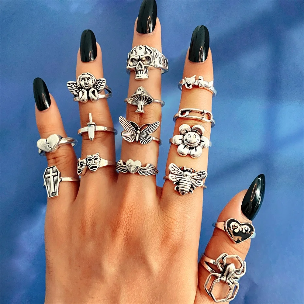 Женское кольцо в стиле хип-хоп FNIO, Винтажное кольцо серебряного цвета в готическом стиле с изображением черепа, цветка, ангела, бабочки, сердца, модное Ювелирное Украшение