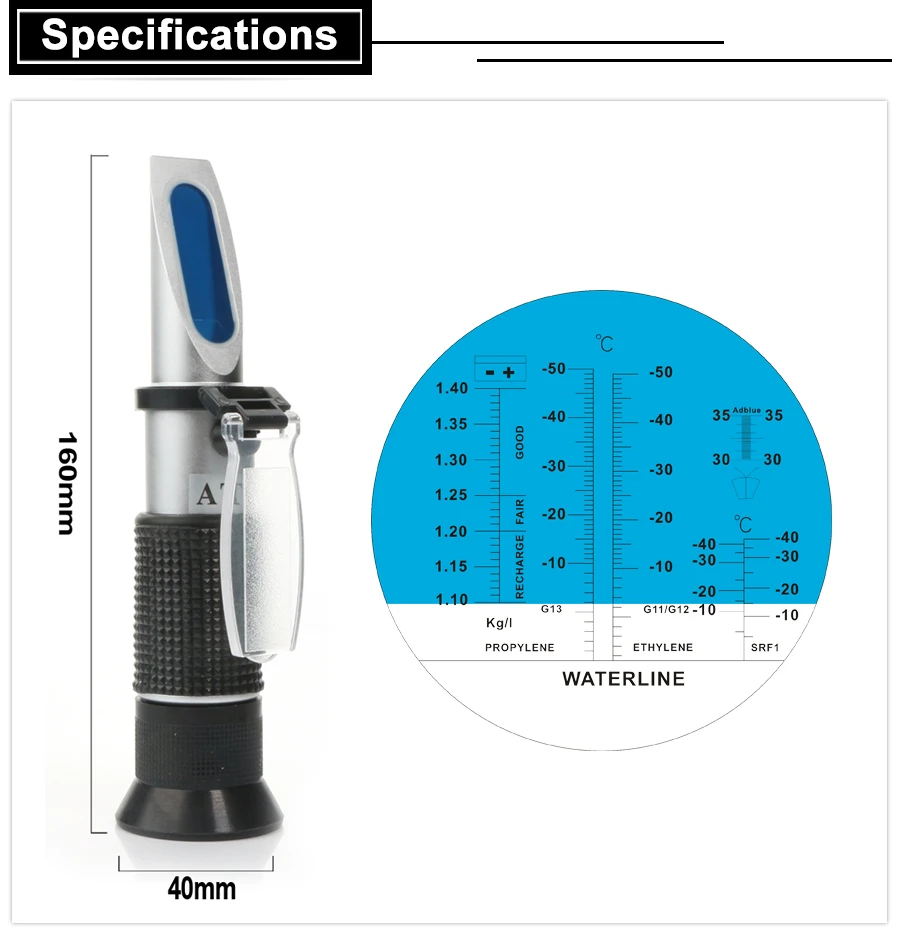 Этот оптический рефрактометр предназначен для измерения охлаждающей жидкости и антифриза на основе этиленгликоля или пропиленгликоля, состояния аккумуляторной жидкости и антифриза (жидкость для мытья лобового стекла) на основе этанола, а также изопропилового спирта. Пожалуйста, ознакомьтесь с приведенной выше таблицей размеров, слева направо, первая шкала предназначена для измерения удельного веса аккумуляторной кислоты, второй предназначен для измерения точки замораживания системы антифриза на основе пропиленгликоля или этиленгликоля, Третий предназначен для измерения точки замеров жидкостей для очистки ветрового стекла.