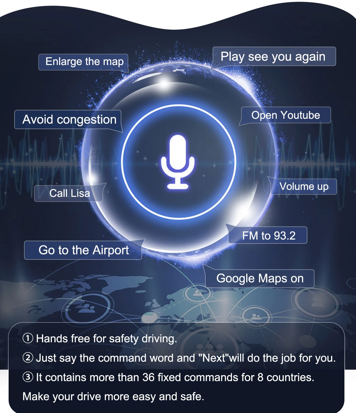 ● Свободные руки для безопасного вождения.● Просто скажите командное слово и «Nex» сделает вашу работу, например, откройте навигацию, откройте музыку, Воспроизведите видео. Содержит более 36 фиксированных команд для 8 стран. Сделайте ваш диск более легким и безопасным.