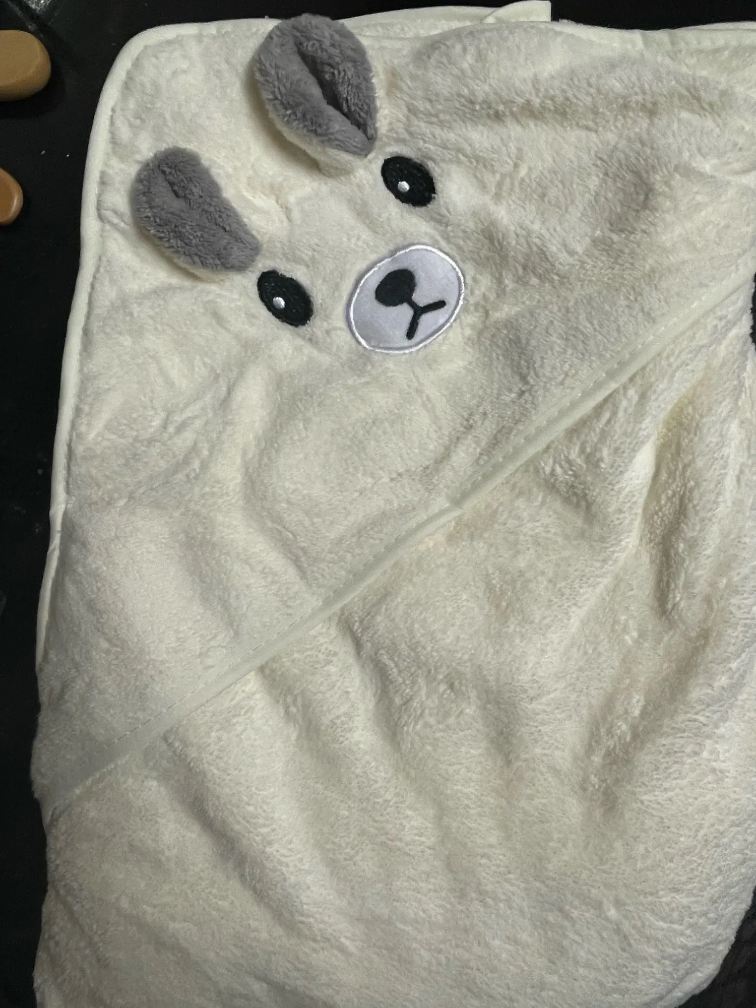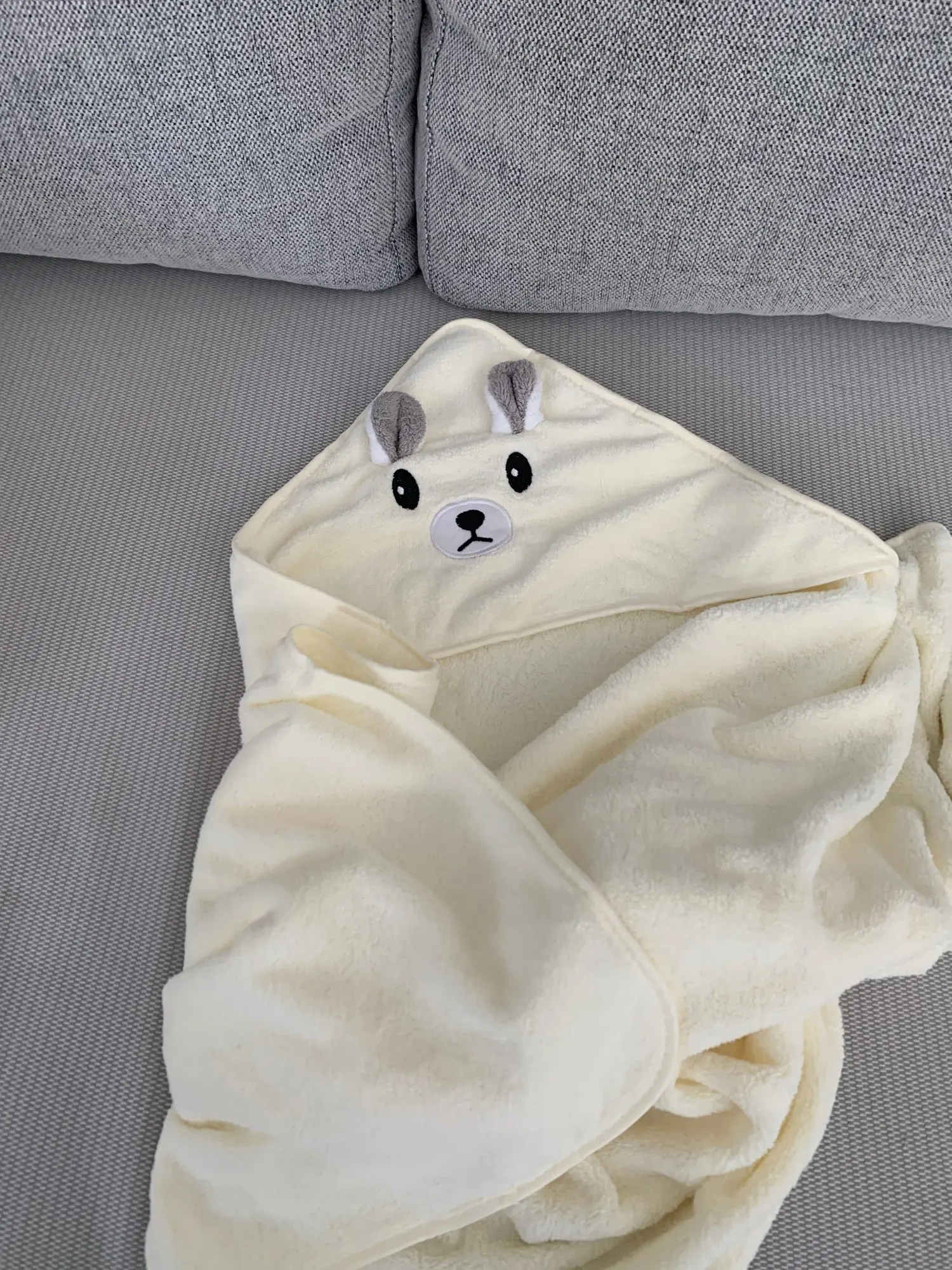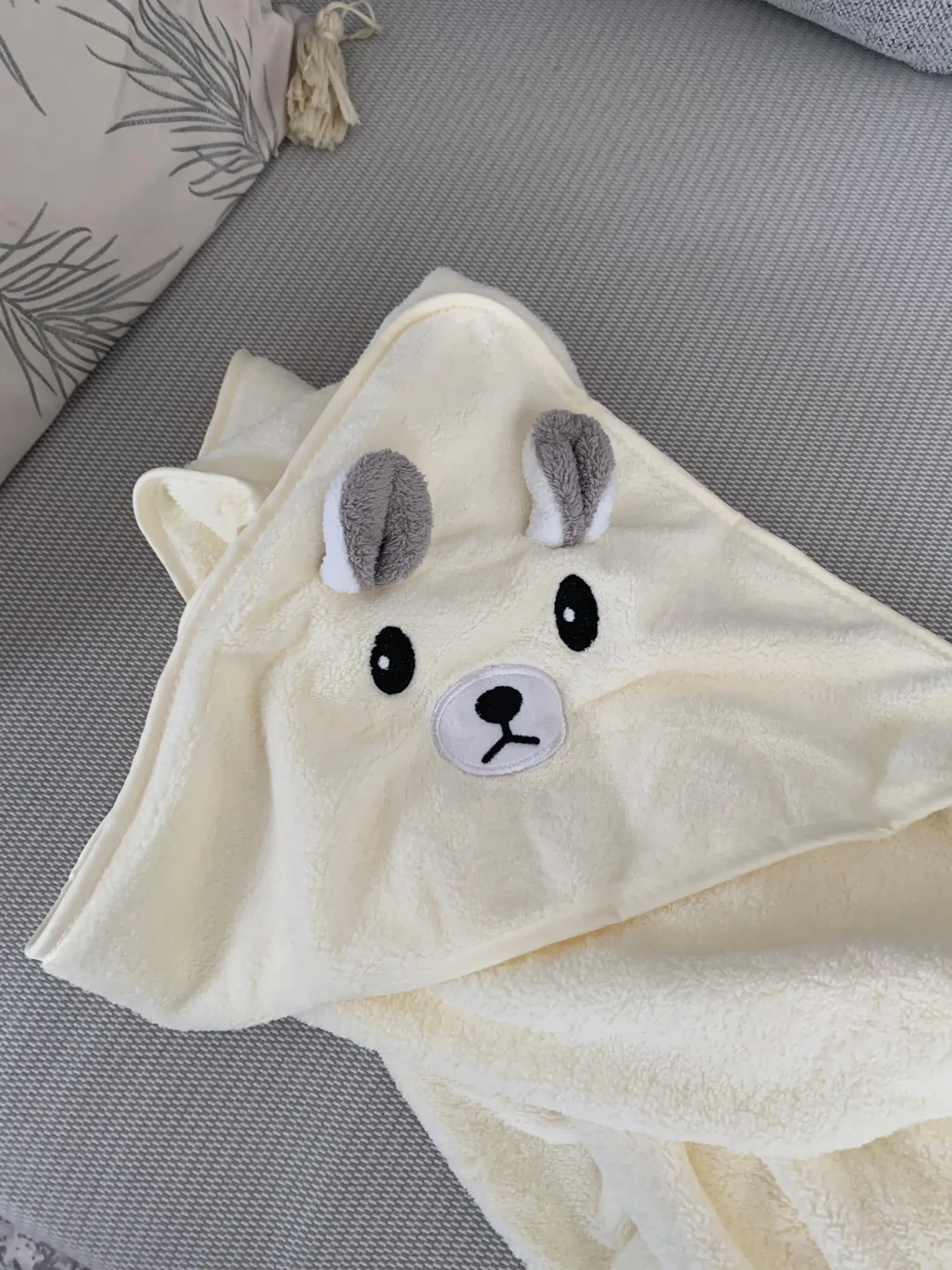 Очень мягкое плющевое полотенце, как на фото выглядит и оттенок серого такой же. Покупала для новорождённого ребёнка, очень удобно, что есть капюшон
