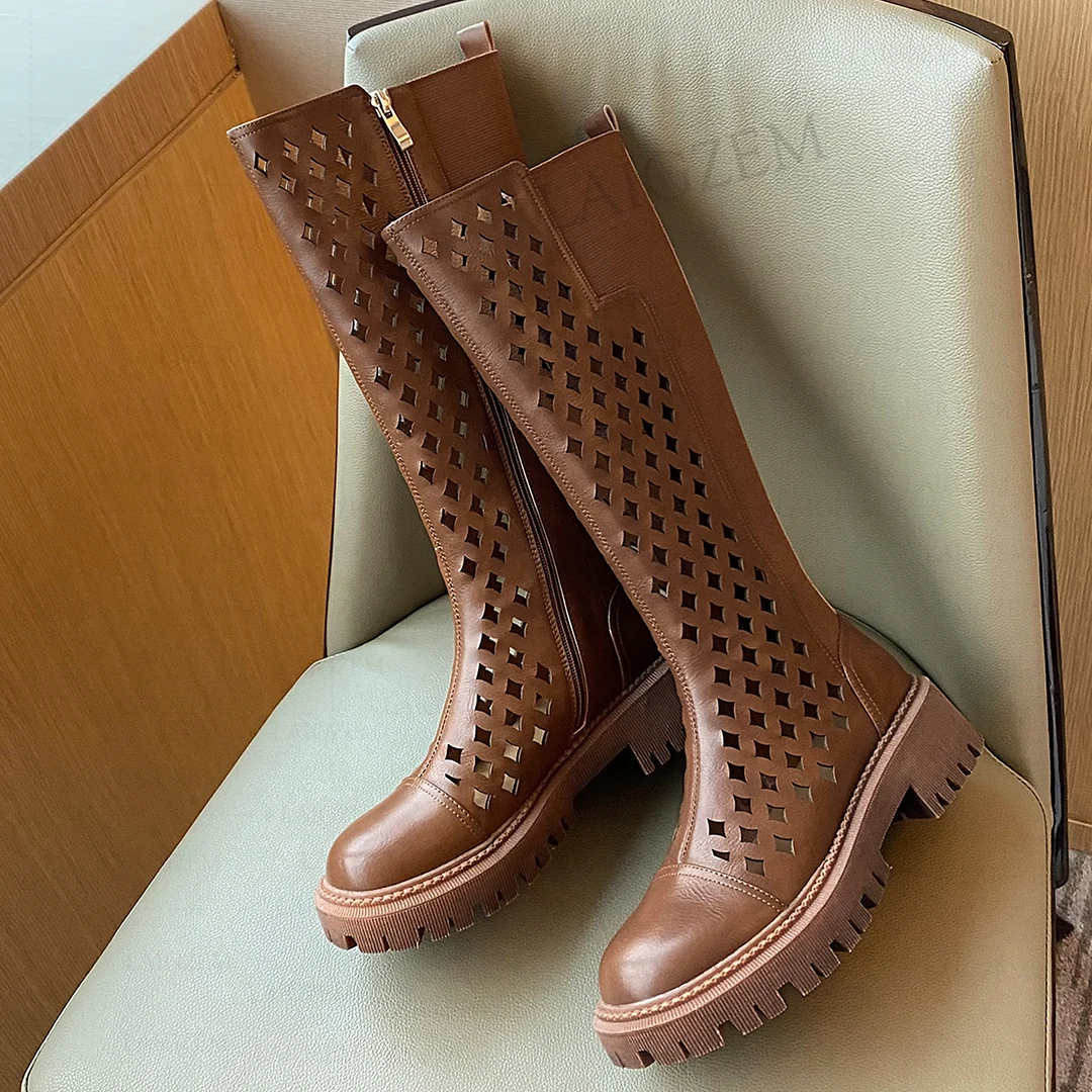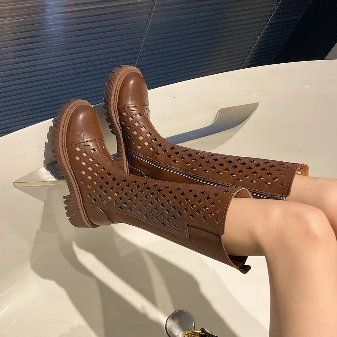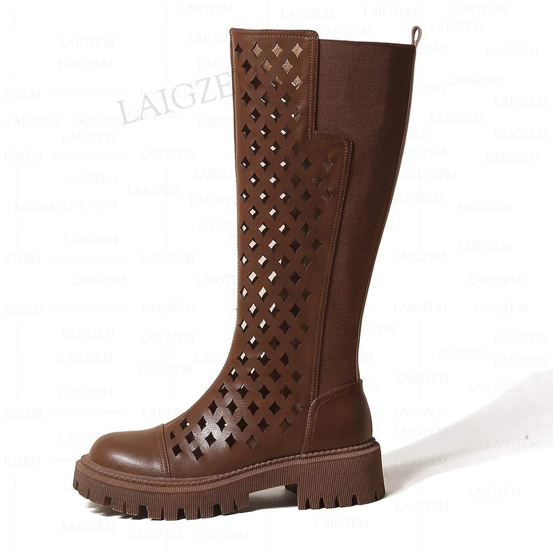 LAIGZEM/женские летние сапоги до колена; Удобные сапоги до середины икры из натуральной кожи с вырезами и боковой молнией на среднем каблуке; Женская обувь; Размеры 37, 39, 40