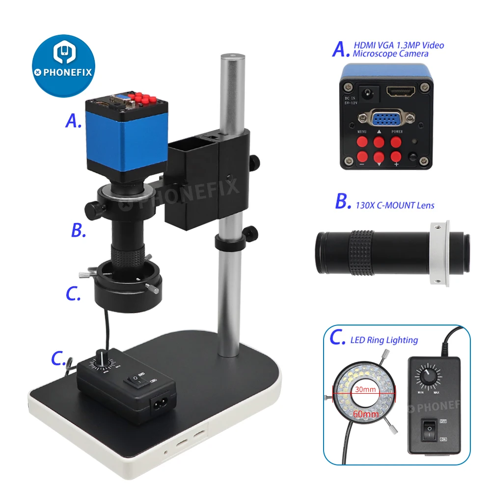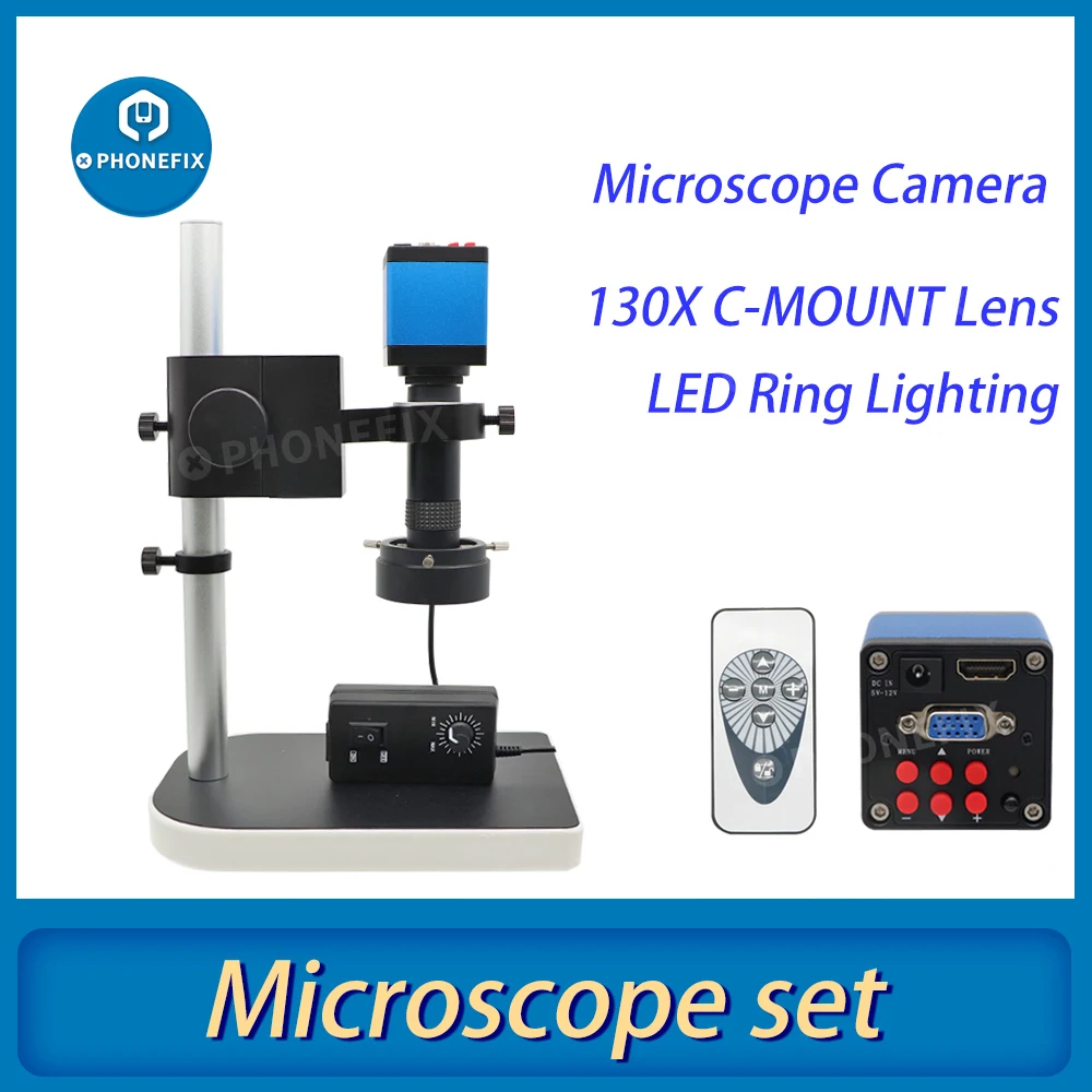 Цифровой видеомикроскоп, 1080P, 13 МП, HDMI, VGA, для электронной пайки, объектив с креплением 130X, регулируемый светодиодный кольцевой светильник для ремонта телефонов
