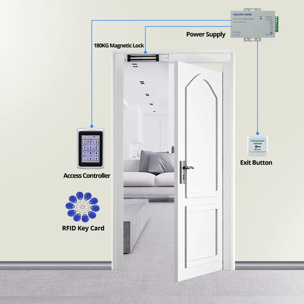 Блок питания и электрический замок, кнопка выхода, дверной звонок Нет В посылка входит, если вам это нужно, пожалуйста, свяжитесь с нами.