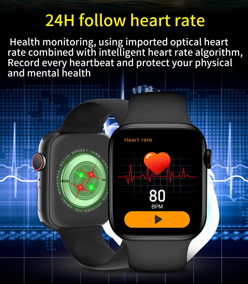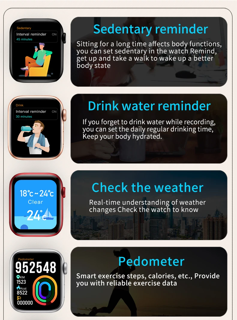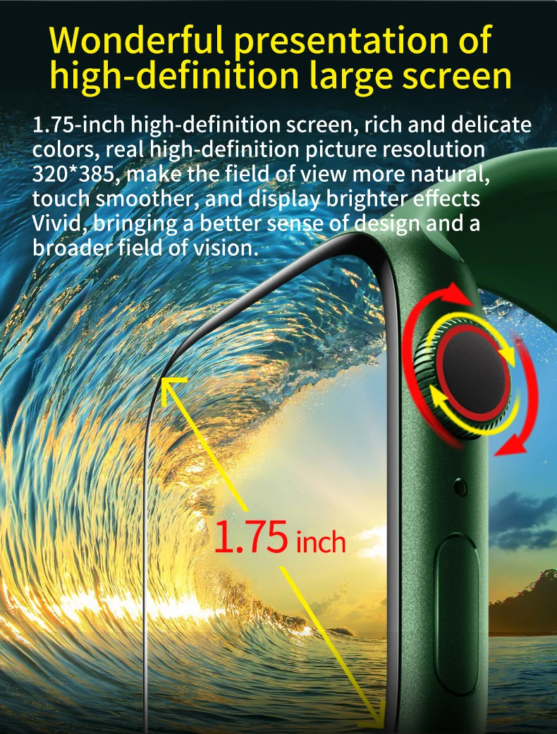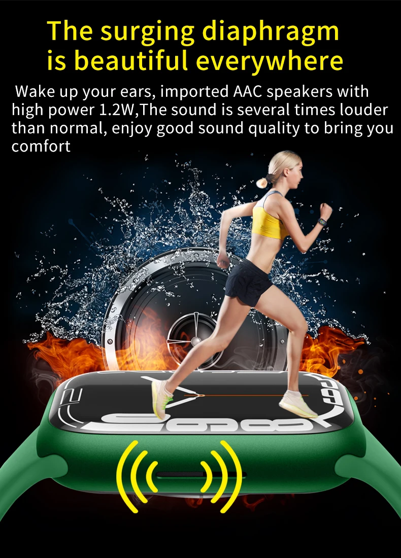 Поддержка 1,75 дюймовым экраном, вызовов через Bluetooth, сердечный ритм, измерять кровяное давление, оксиметр, температура тела, Мути-режимы тренировок, обмен 44 мм, ремешок, прослушивание музыки через bluetooth, может таможенные циферблатов, разделенным экраном, 4UI, игра, погода, кнопка поворота, блокировка паролем, беспроводной способ зарядки.