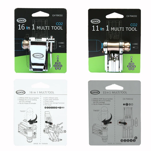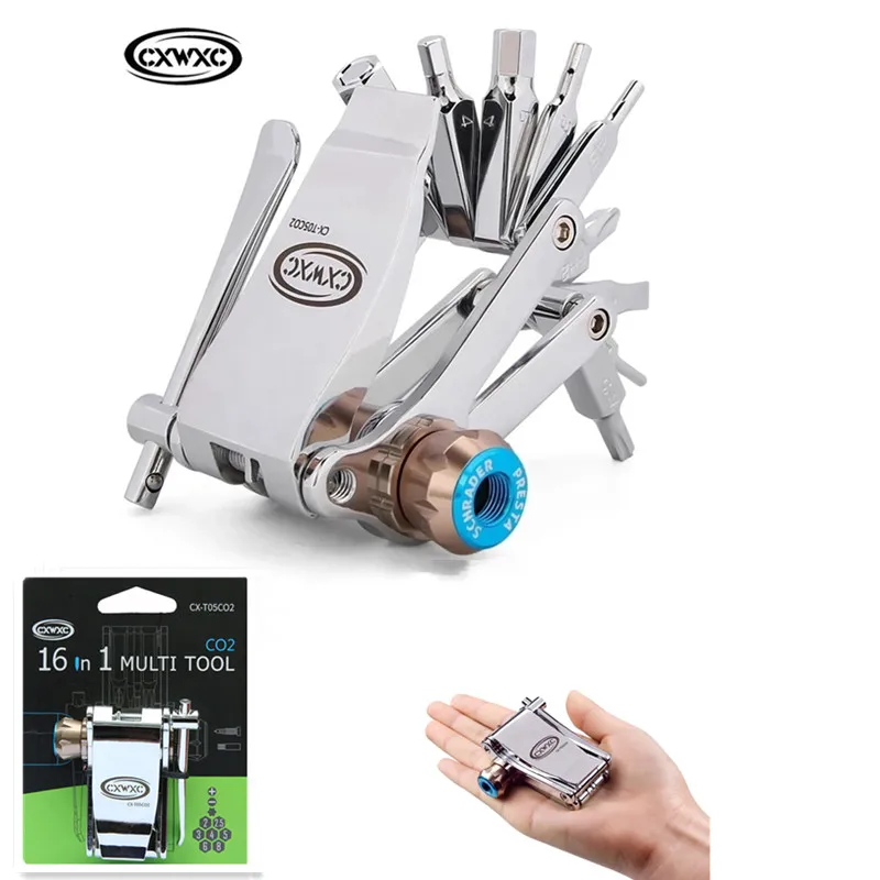 [16 в 1 инструмент для ремонта велосипедов]: особенности 2, 2,5, 3, 4, 5, 6 и 8 мм шестигранные ключи, Torx T25, отвертка flathead, отвертка Phillip, цепной выключатель, инструмент с сердечником клапана presta, 2 рычага для шин, устройство для хранения звеньев цепи и адаптер картриджа CO2
