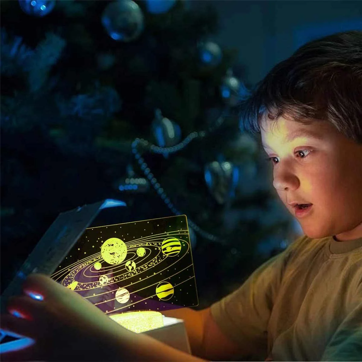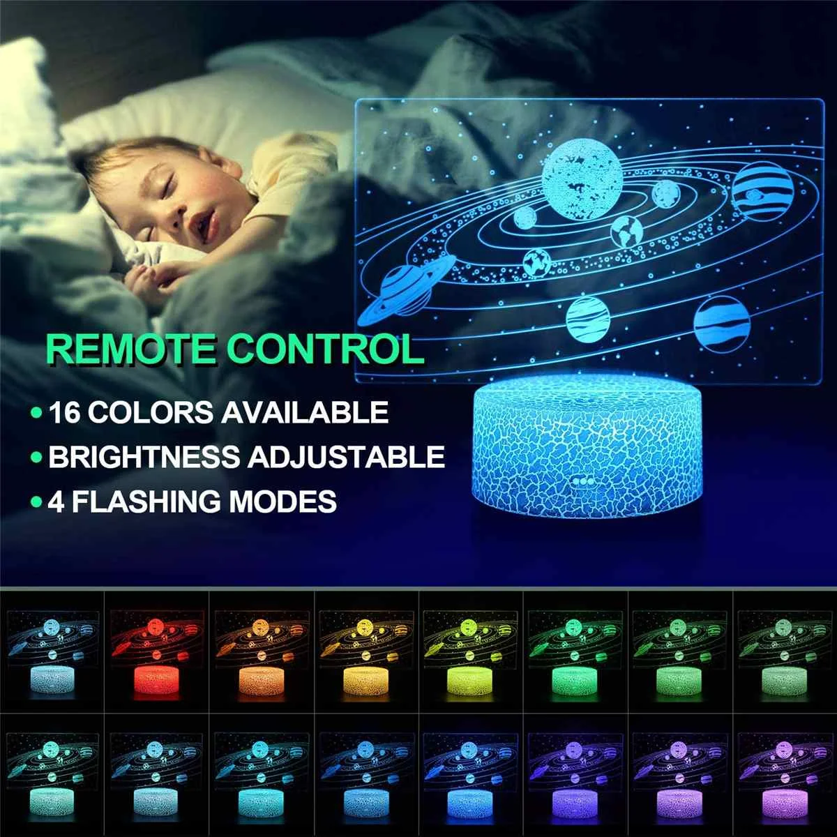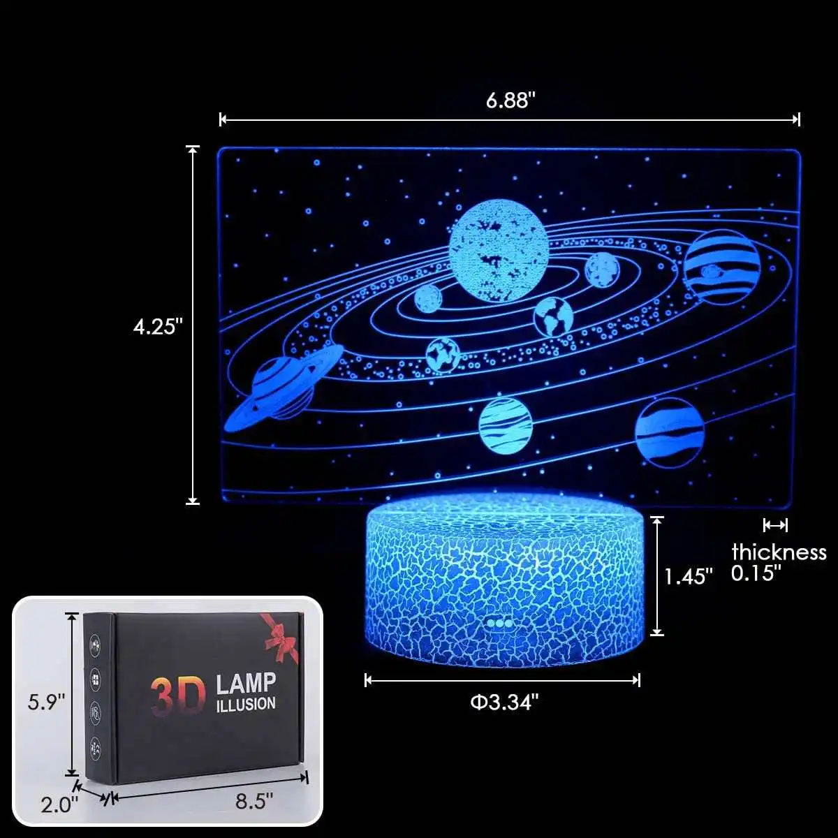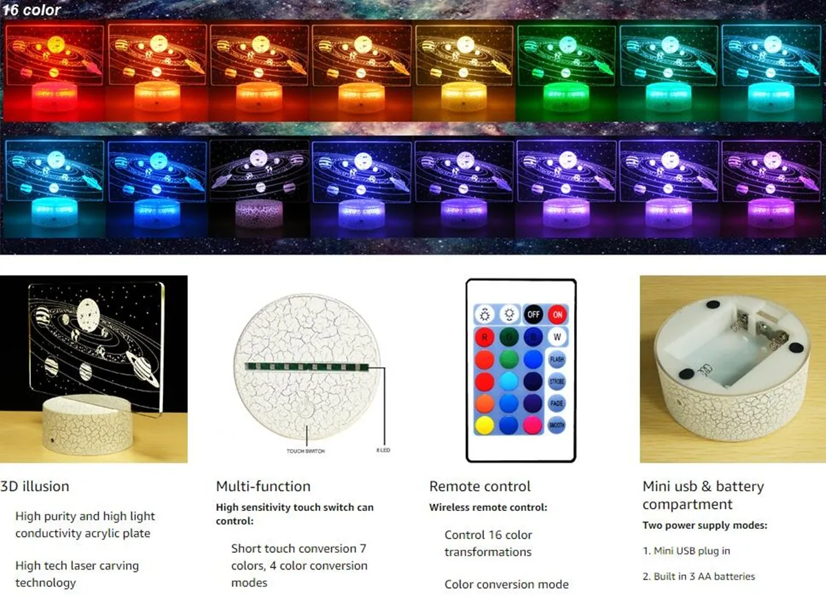 Спецификация:Тип: 3D креативная настольная лампаСтиль: солнечная системаМатериал: акрил и АБС-пластикНапряжение: 5 ВВход питания: 5 В USB источник питания или 3 * АА батареи(Не входит в комплект)Размер: 6.89x5.79inСветильник: 16 цветов