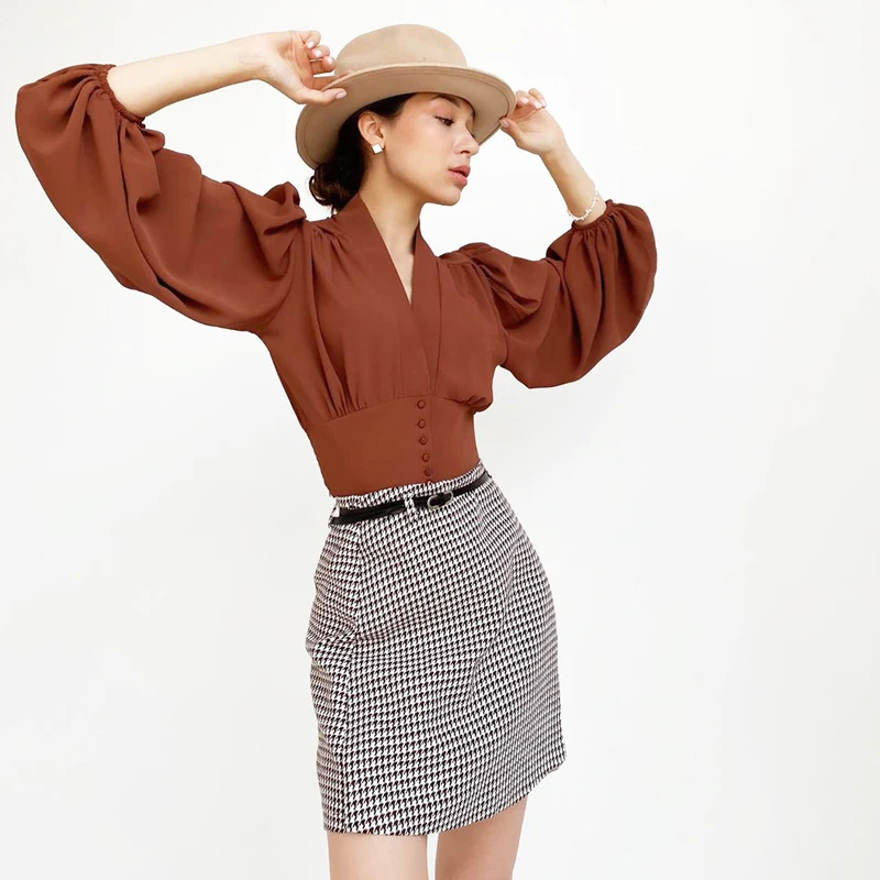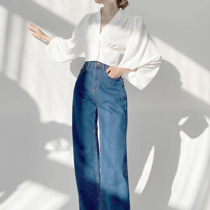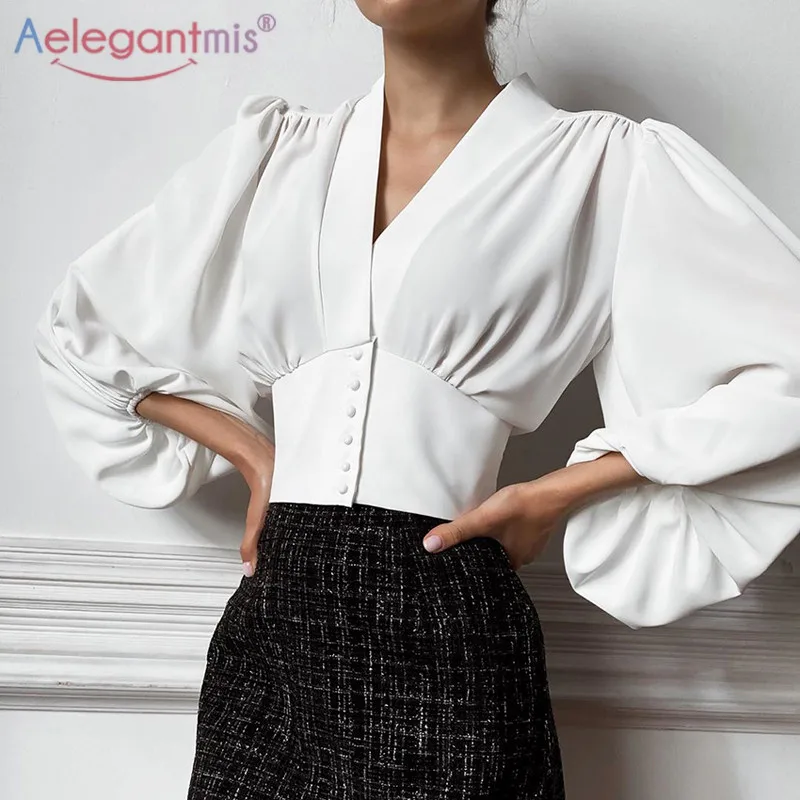 Женская офисная блузка Aelegantmis, белая элегантная винтажная приталенная блузка с глубоким V-образным вырезом и рукавами-фонариками, в французском стиле