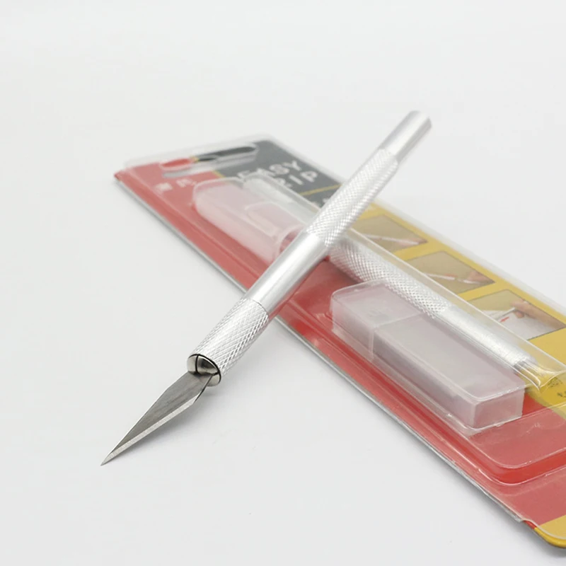 Товары: 1 Ручка ножа, 6 лезвий, 1 крышка ручки, 1 коробка ножаПолностью алюминиевая ручка, нескользящая конструкция, удобная ручка;SK-5 лезвие из легированной стали, острый и долгий срок службы;Сменные лезвия (6 шт. в комплекте)Дуга и ширина держателя инструмента являются точными. (Решить проблему с углом наклона задней части лезвия)Оксид натурального алюминияХарактеристики продукта: 140 мм * Φ8 ммМетод упаковки: opp упаковкаЦвет: серебристый