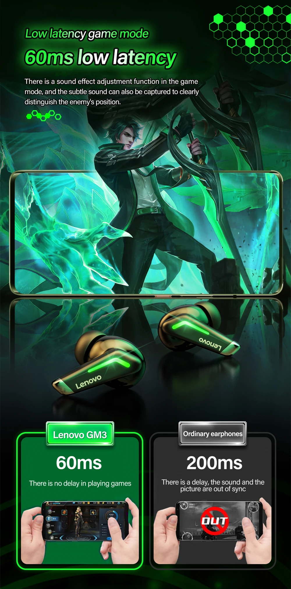 Игровая гарнитура Lenovo GM3 TWS с низкой задержкой и светодиодным ...