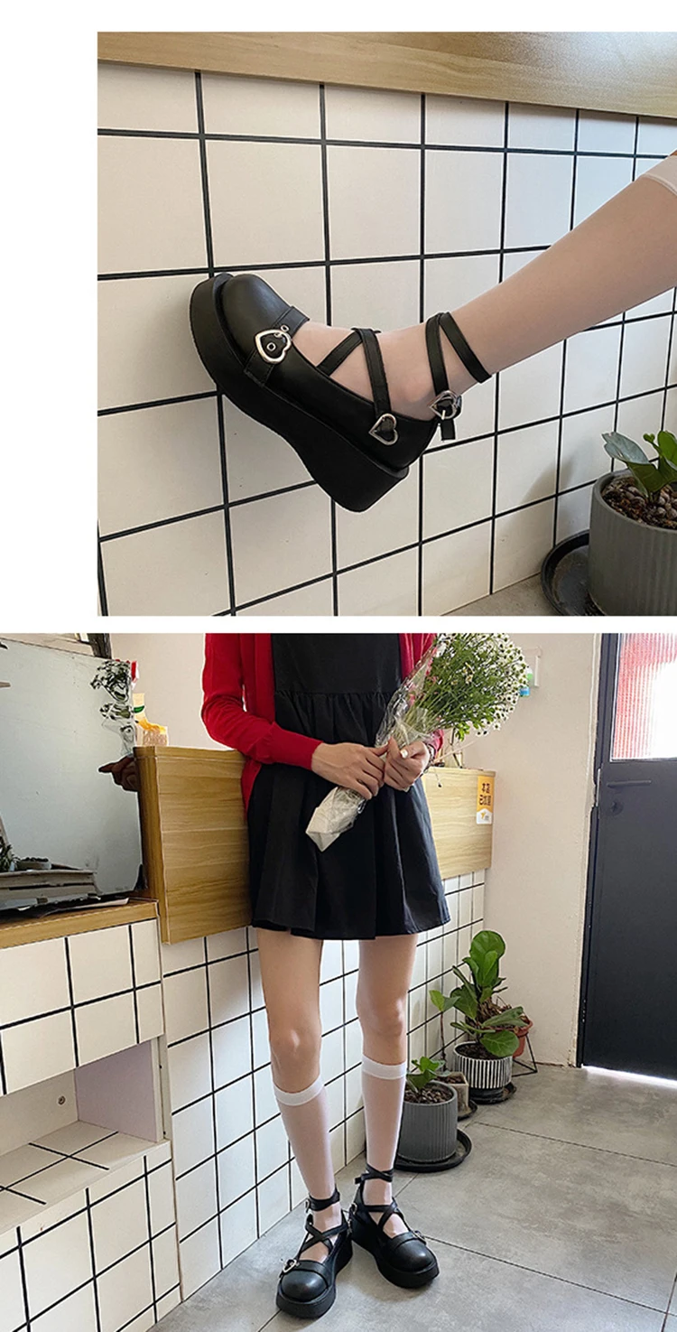 Туфли женские на платформе в стиле "Лолита", толстая обувь на танкетке, с перекрестным поясом, Модные Туфли Мэри Джейн в форме сердца, на каблуке