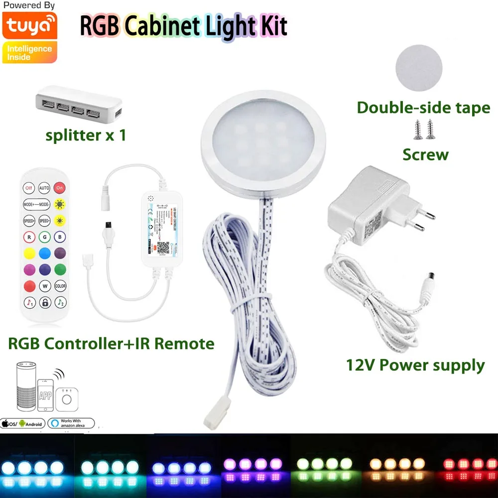 9 светодиодных шайб с RGB изменяющимися цветами, Беспроводное дистанционное управление WIFI с регулируемой яркостью. Все необходимые Аксессуары в комплекте: адаптер, сплиттер, удлинительные кабели, клейкие ленты, очень легко установить и защитит вашу мебель. Адаптер AC100/240V К dc12в гарантирует, что набор ламп под шкафом очень безопасен для прикосновения. Лампы для шкафа изготовлены из алюминиевого сплава, а не пластика, обеспечивая очень хорошую теплоотдачу и длительный срок службы. Обратите внимание: белый цвет-это красный, синий и зеленый светильник, а не чисто белый. Многофункциональная RGB изменяющая цвет Светодиодная подсветка под шкаф с ZIGBEE 3,0 беспроводной пульт дистанционного управления с регулируемой яркостью шайба комплект для кухонной мебели освещение настроения.