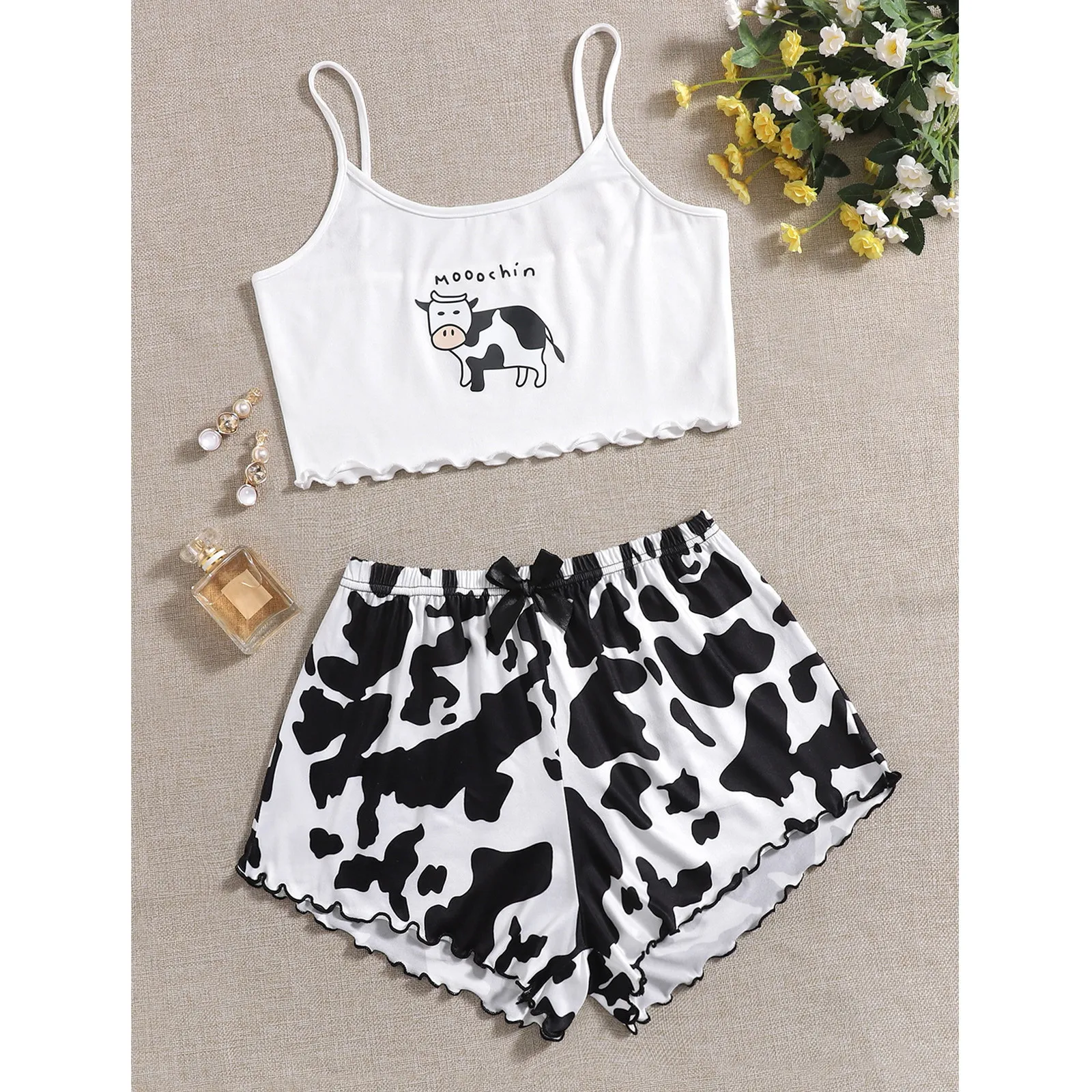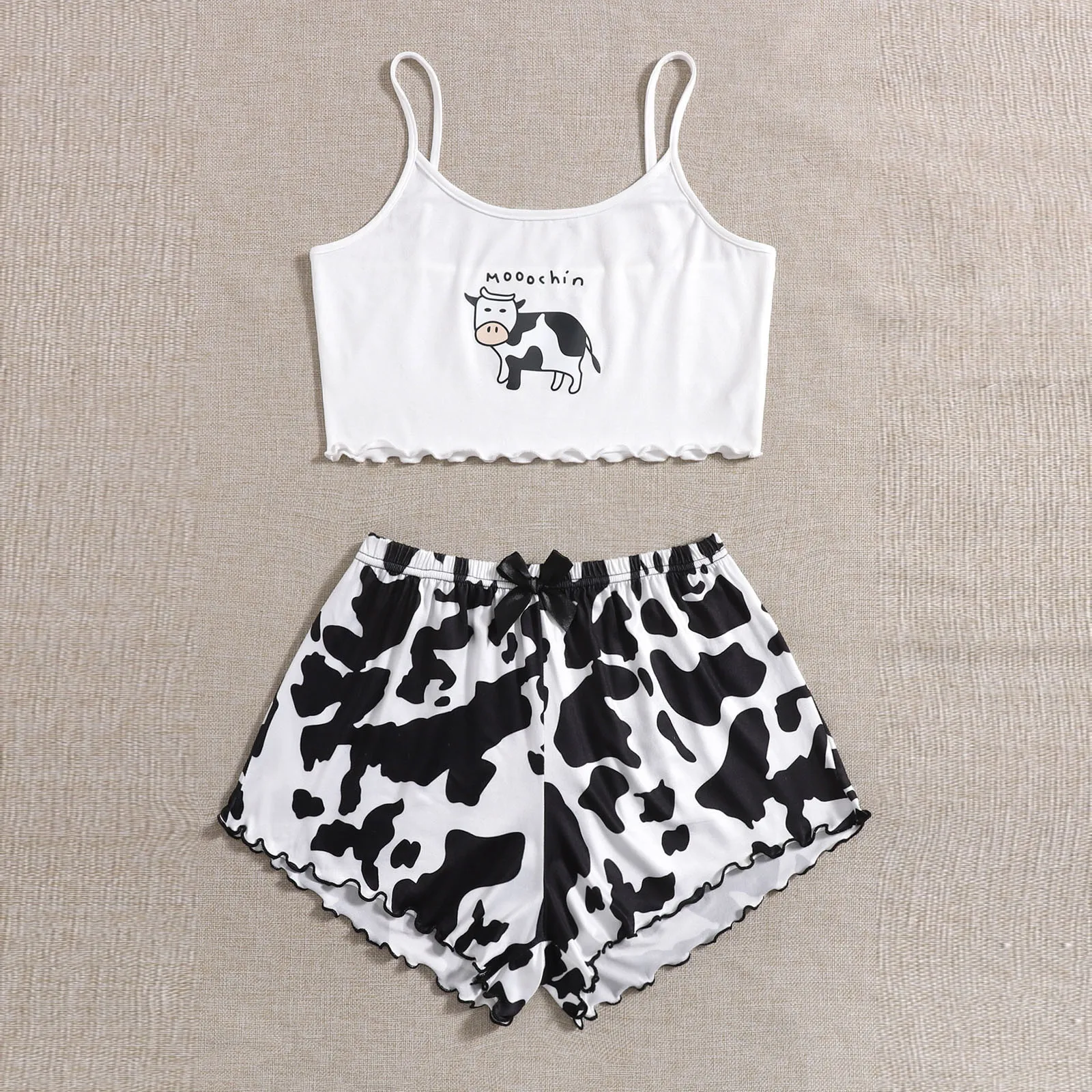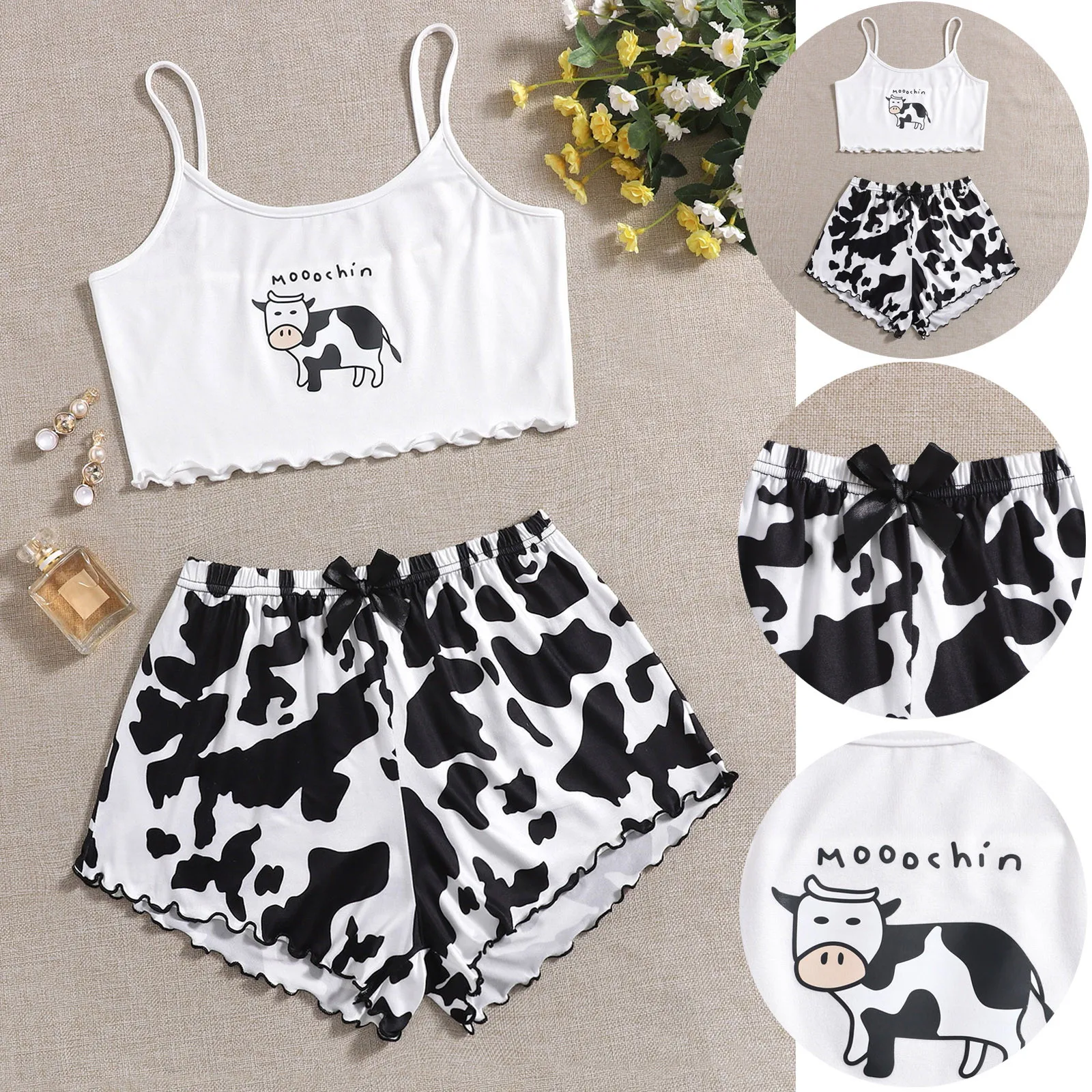 Пижама женская летняя без рукавов, пижама Корова на бретелях-спагетти, верхняя одежда для сна, 2 шт.