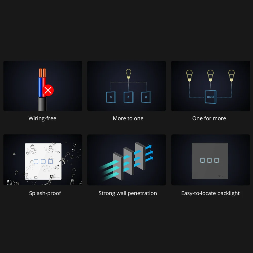 Пульт дистанционного управления с 1/2/3-gang работает как и другие обычные переключатели на светильник, но позволяет управлять подключением светильник s с расстояния, и не требуется провод, просто приклейте его к использованию. Несколько банд позволяют реализовывать два решения дистанционного управления, один пульт дистанционного управления SONOFF для управления несколькими светильник с управлением и несколько пультов дистанционного управления SONOFF для управления светильник. Кроме того, пульт дистанционного управления может использоваться для подключения Настенный выключатель SONOFF T1/T2/T3 Для достижения двустороннего контроля. Также используется foR RFR2, RFR3, 4CHPROR3 И SlampherR2 Который предоставляет вам еще один способ управления, за исключением дистанционного управления приложением и голосового управления. Задний светильник разработан на сенсорной кнопке, чтобы дать вам четкое местоположение, чтобы контролировать светильник в ночное время. Поглощающая энергия от светильник определяет яркость задний светильник, чем больше энергии он поглощает, тем выше его яркость. Три способа использования могут быть выбраны из ручки, винта и столешницы.
