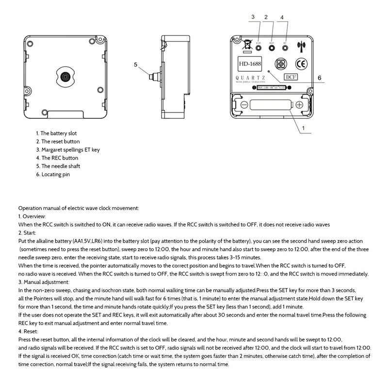 1. Часы могут автоматически синхронизировать немецкий DCF сигнал2. Стандартное движение содержит миниатюрный радиоприемник, который ищет низкочастотный сигнал времени, который передает с немецкой радиостанции DCF.3. Хорошее радио движение будет работать хорошо, простой дизайн, простота в использовании, энергоэффективность, точное время хранения.4. Качественный материал: корпус изготовлен из прочного и долговечного материала, а стрелки часов изготовлены из качественного алюминия, светильник, устойчивый к воздействию коррозии и приятный для использования и декоративного эффекта. Качественный кварцевый часовой механизм, гарантированный длительный срок службы.5. Этот комплект является хорошей заменой размера как с точки зрения вала, так и размера рук. Это может быть замена сломанных часов. Отлично подходит для ремонта, замены или изготовления часов. Вы можете использовать его для ремонта, замены или изготовления домашних часов; Подходит для вышивки крестиком, трехмерной вышивки, ремесленных домашних часов, безрамочных часов, часовых часов, И т. д. Идеальный набор часов DIY, И специально подходит для DIY кварцевой стены Замена для часов частей движения и т. Д.1 обзор:Когда переключатель RCC находится в положении ON, он имеет функцию приема радиосигналов. Если он находится в выключенном положении, прием радиосигналов не выполняется.2. Старт:Поместите щелочную батарею (AA1.5V, LR6) в слот для батареи (обратите внимание на полярность батареи), вы можете видеть, что вторая рука опускается до нуля (иногда вам нужно нажать кнопку сброса), после подметания до 12:00, часа, минутная стрелка также начинает 12:00, И после окончания трех рук, он входит в принимающее состояние и начинает получать радиосигналы. Этот процесс занимает 3-15 минут.Спецификация:Тип: бесшумные радиочасыОбщая длина вала: 14 мм. Резьба: 6 ммЧасовая стрелка: прибл. 79 ммМинутная стрелка: прибл. 120 ммВторая рука: прибл. 140 ммРазмер хоста. 56x56x16 ммНоминальное напряжение: 1,5 VСрок службы батареи (спецификация): прибл. 12 месяцевПрименение Батарея: один 1,5 V AA Углерода Батарея (не входит в комплект)Цвет: черныйМатериал: пластик + алюминийПосылка:1 * нетикающий радиомеханизм3 набора * 3 стрелки часов1 комплект * аксессуарыПримечание: Это радио волновое движение ограничено только Германией и Великобританией. Он может использоваться только при получении сигнала. Пожалуйста, знайте!Только вышеуказанная посылка, другие товары не включены.Примечание: светильник и различные дисплеи могут привести к тому, что цвет товара на картинке немного отличается от реального. Допускается погрешность в измерениях +/- 1-3 см.