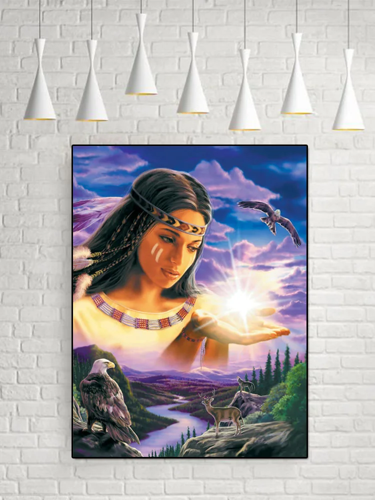 Алмазная вышивка с изображением индейской женщины, волка, животных, пейзажа