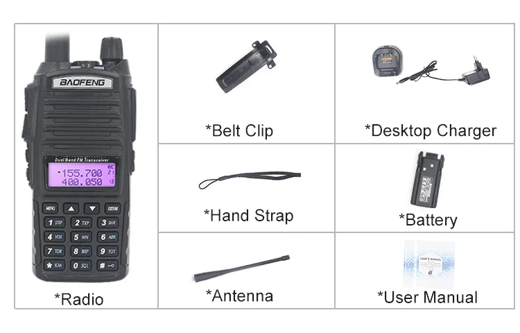 2 X UV-82 корпус2 X Антенна2X7,4 V/2800mAh BL-8 батарея2 X литий-ионное зарядное устройство (штепсельная Вилка EU/US/UK/AU)2 X Зажим для ремня2 X ремешок для рук2 X Руководство пользователя на английском языкеВы можете выбрать другие аксессуары в соответствии с фотографиями и вашими требованиями.